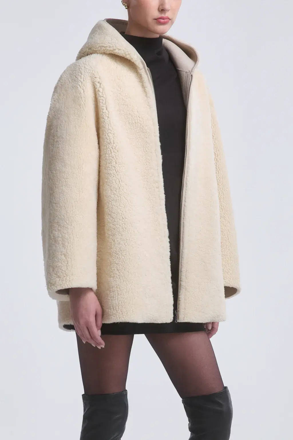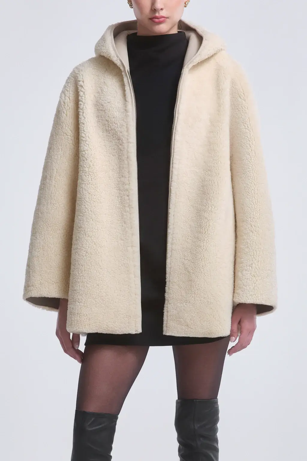 An oversized hooded coat in plush, textured shearling. Relaxed silhouette with dropped shoulders, wide sleeves, and zip closure. Soft proportions built for layering.