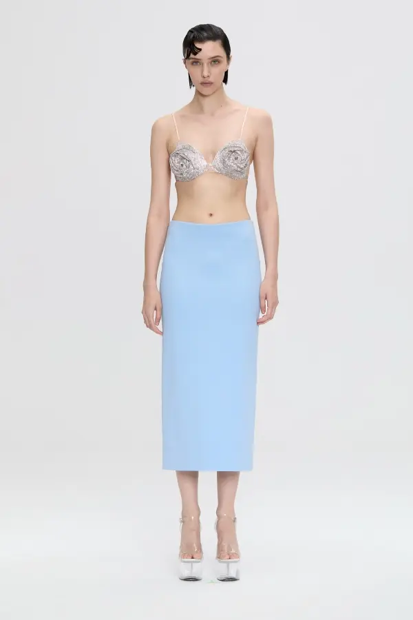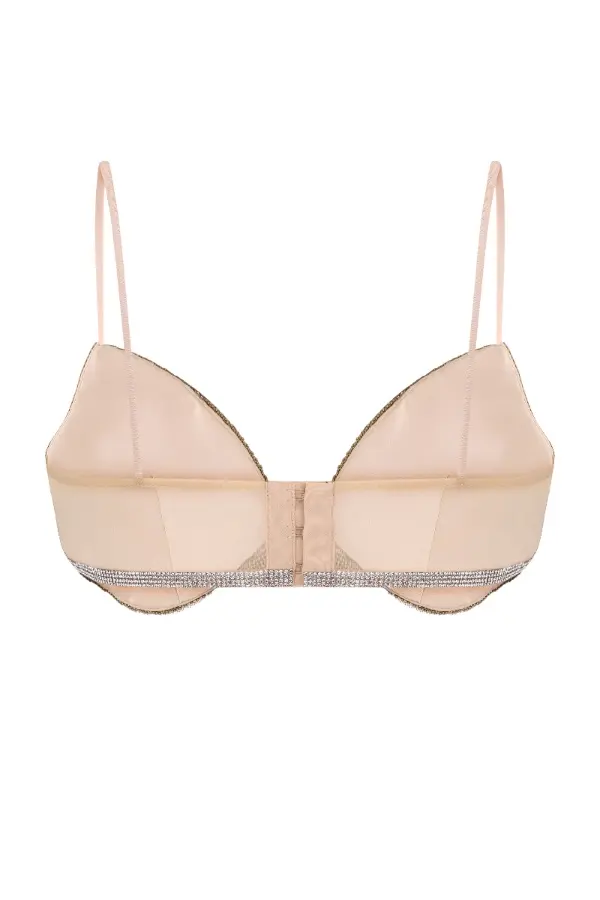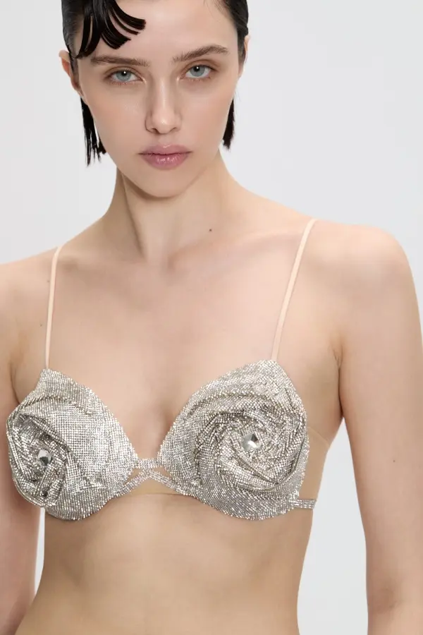 A bra embellished with voluminous roses cut from Nué signature rhinestone fabric and accentuated with large crystals on the top. Complete with spaghetti straps and lingerie hook-and-eye fastening at the back.