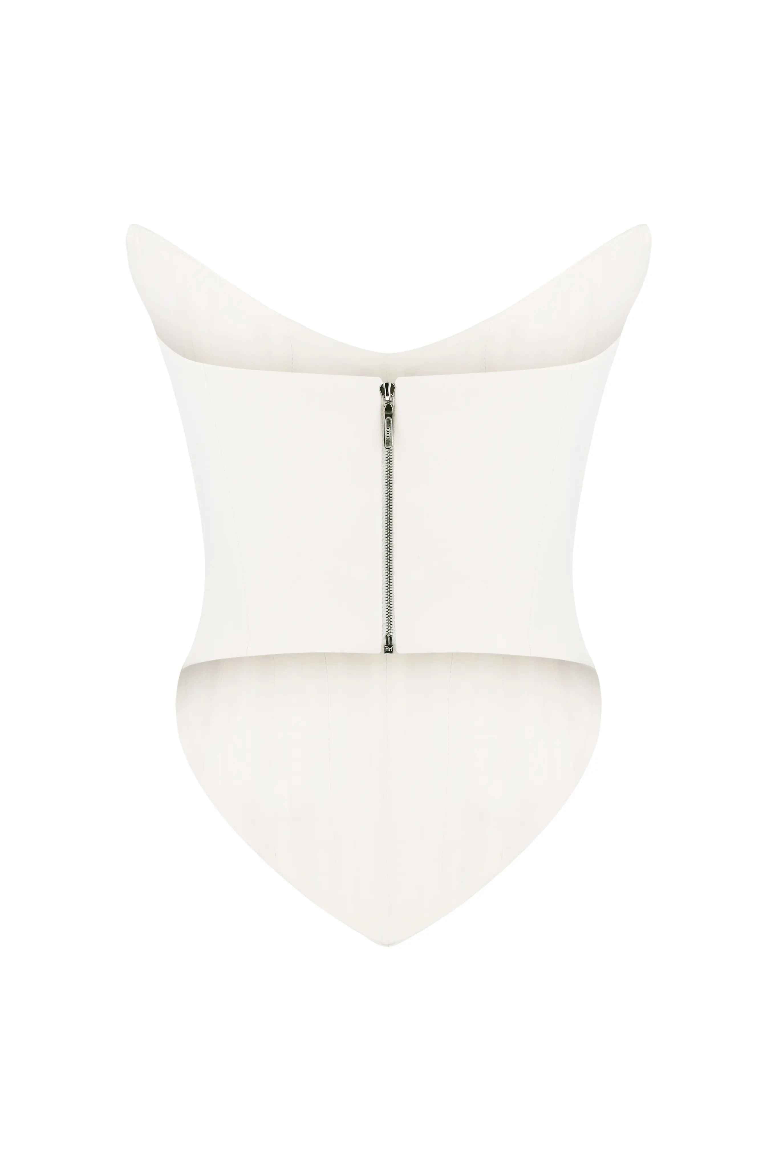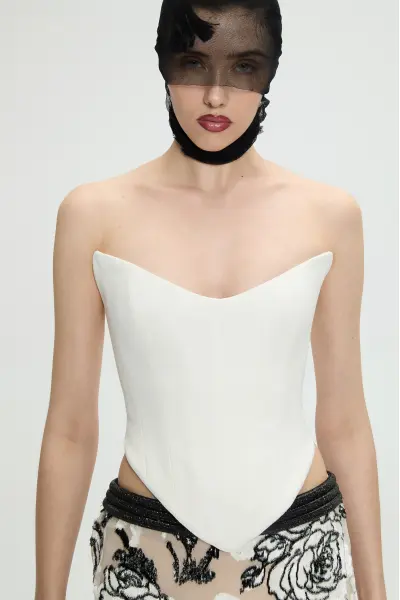 A sculpted strapless corset top features a curved neckline and hem. It is designed with supportive internal boning for a feminine figure-framing fit. Fully lined and complete with a concealed zip fastening at the back.