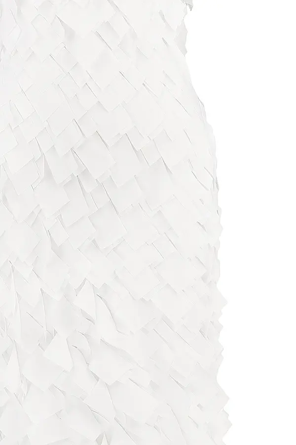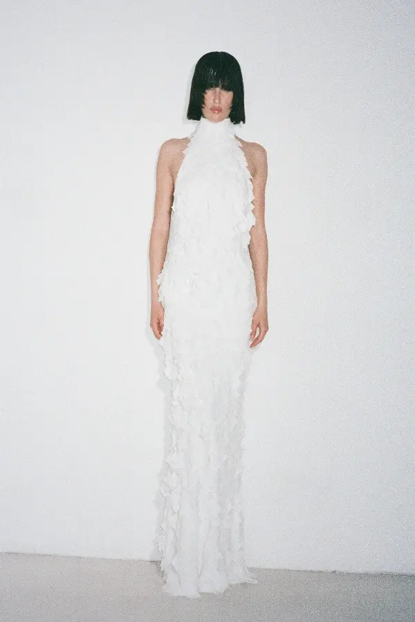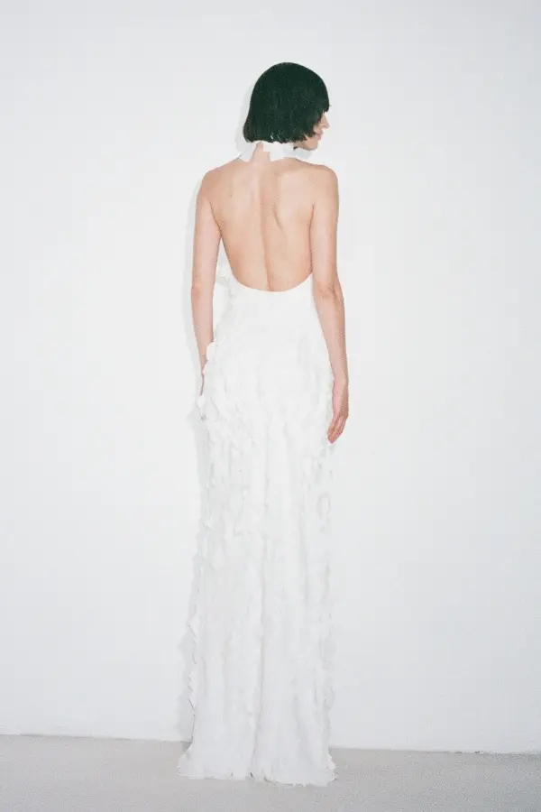 A floor-length gown made of laser-cut appliqué fabric features a halter neckline and an alluring open back, gently skimming the body. It is complete with a concealed zip fastening at the back.