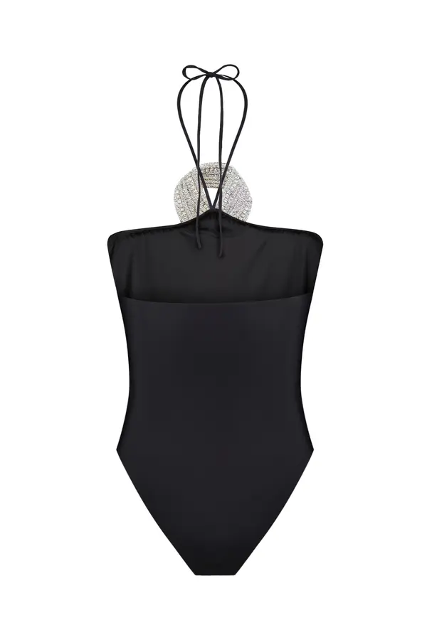 A bodysuit featuring a high-cut leg silhouette, embellished with a signature handcrafted crystal bra designed in a knotted style. Suitable as a one-piece swimsuit.