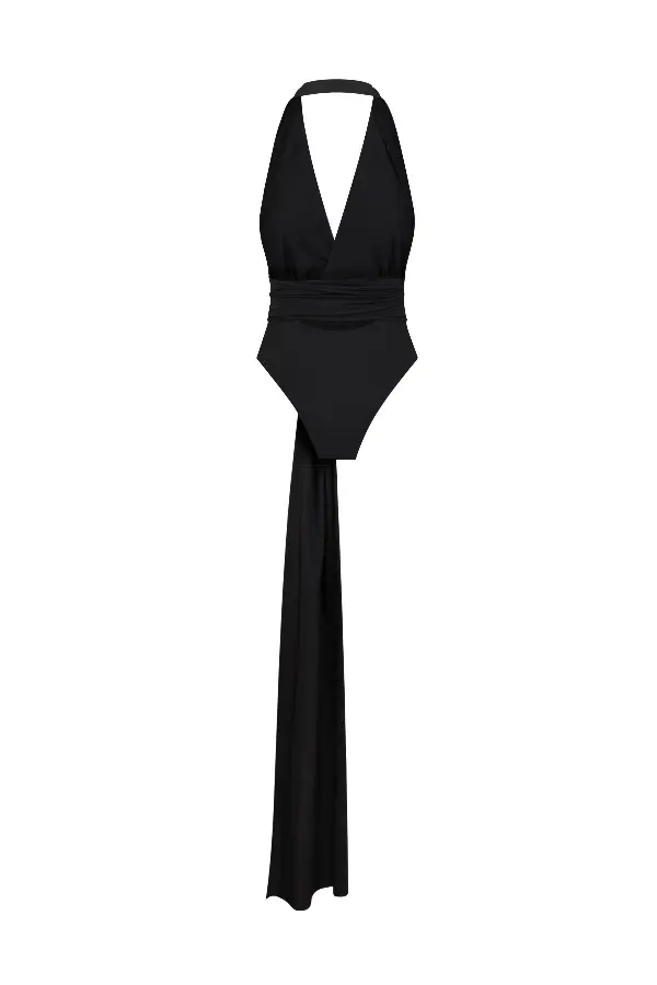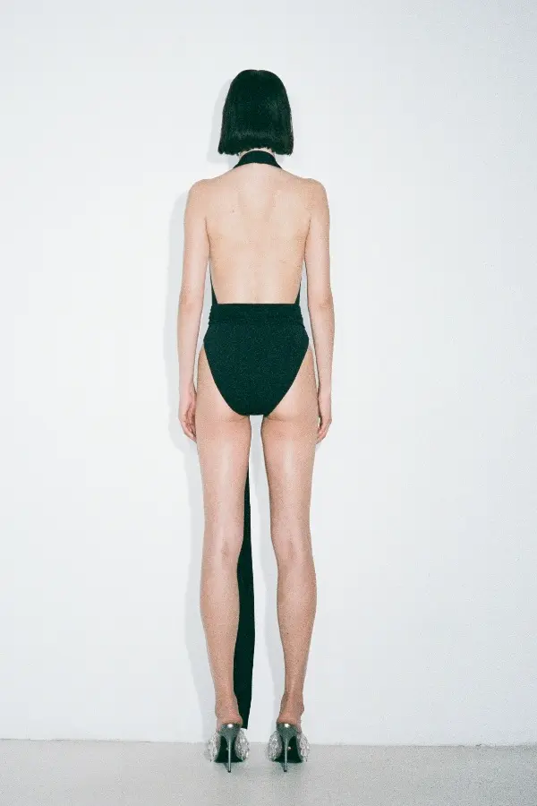 A bodysuit features a backless silhouette with a high-cut leg and a deeply plunging V neckline. It is complemented by an adjustable belt with a textured buckle. Suitable as a one-piece swimsuit.
