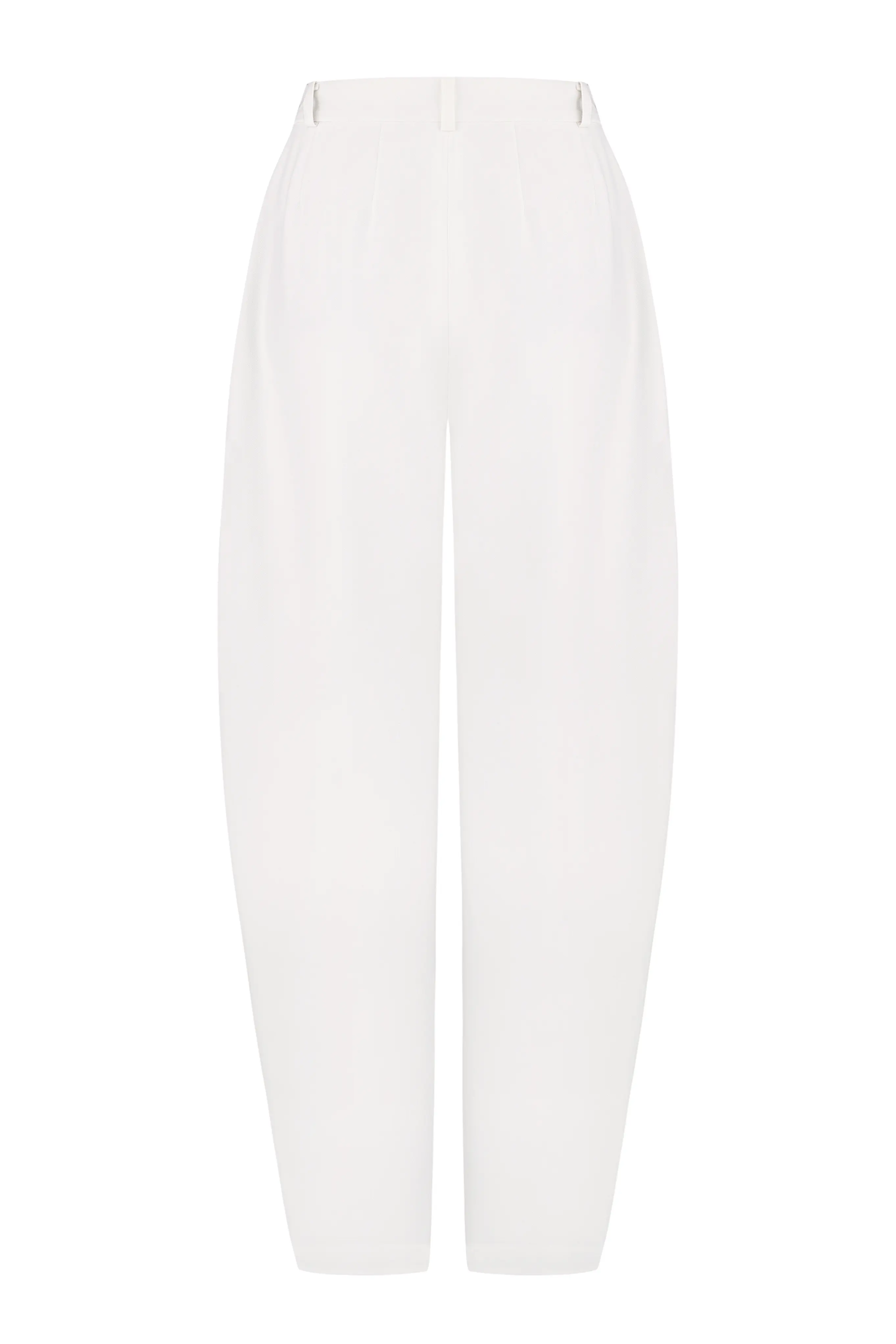 High-waisted trousers with barrel-leg silhouette that curves at the knees before tapering in toward the ankle. The shape features sharp pleats and the slit cuffs. The belt is encrusted with a single mirror detail. Complete with zip and button fastening at the front.