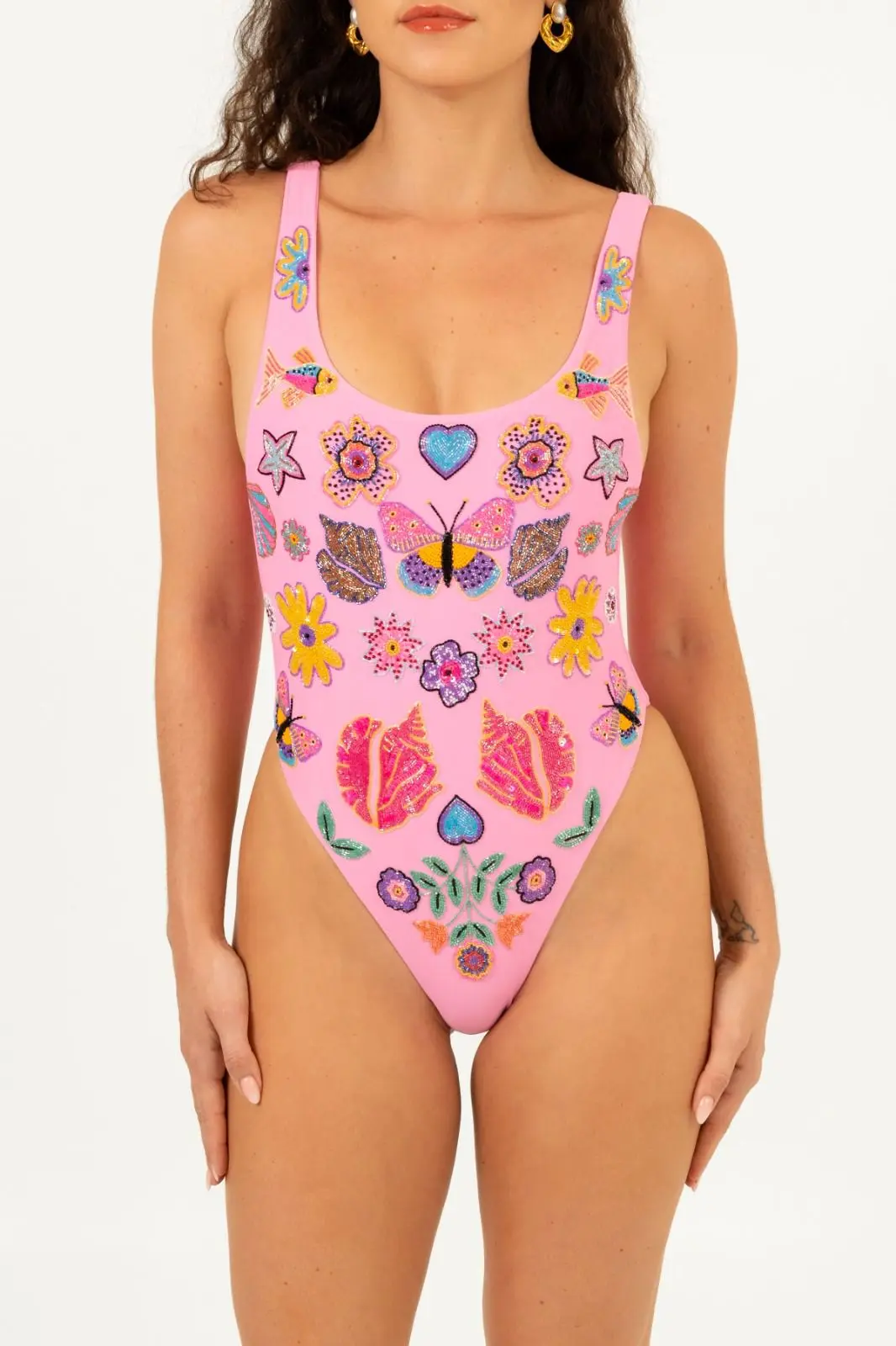This exquisite Mirrored Sea One-Piece Swimsuit features intricate hand-beaded detailing, inspired by the mirrored reflections of the ocean. In a soft pink hue, the design captures the fluidity and beauty of the water, with shimmering beads that mimic the glistening surface of the sea. The flattering silhouette combines elegance with comfort.