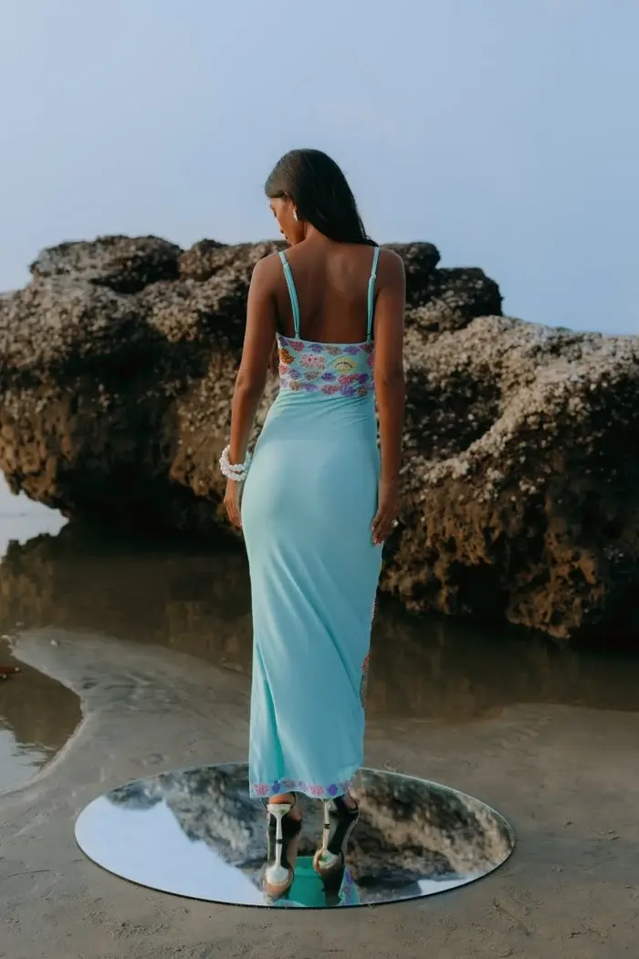 Our bestselling New York style in a strappy dress. Hand-embroidered with crystals and features our sea life inspired motifs