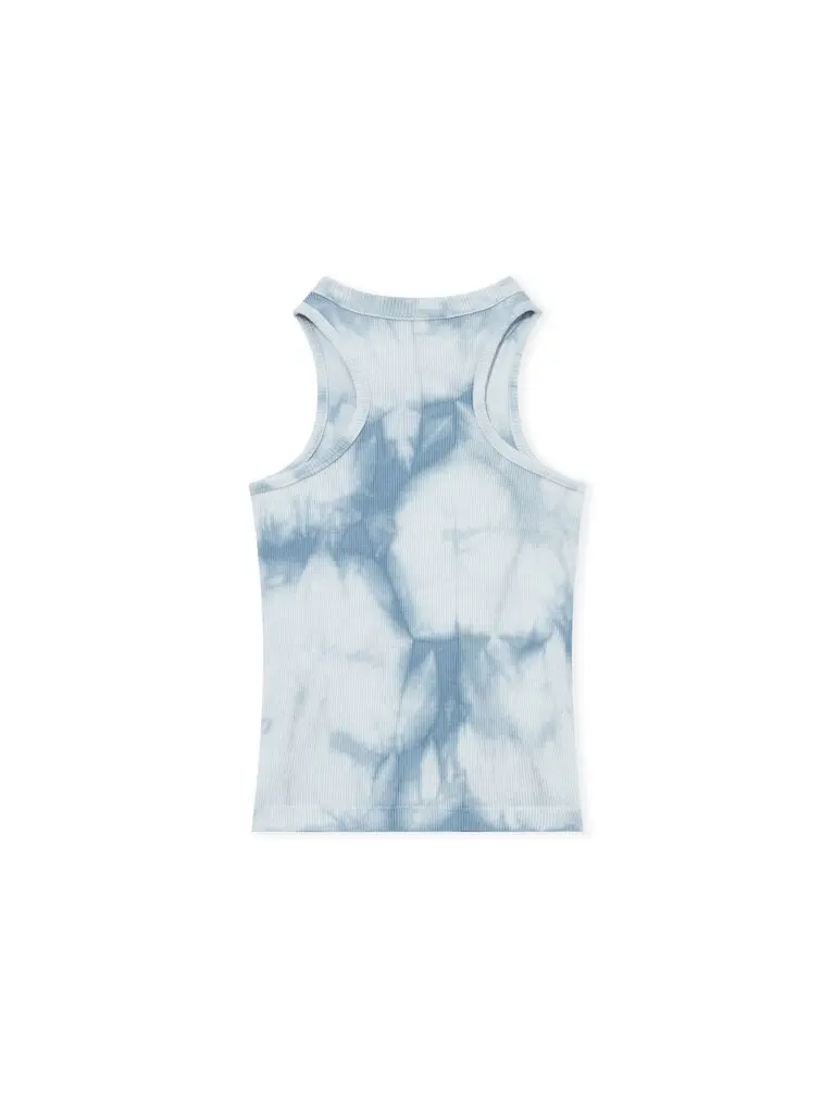The Off Stamp Tie Dye Ribbed Top features an all-over tie-dye effect with a small OFF stamp logo on the front, combining a fitted sleeveless shape with a textured visual finish.