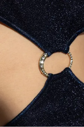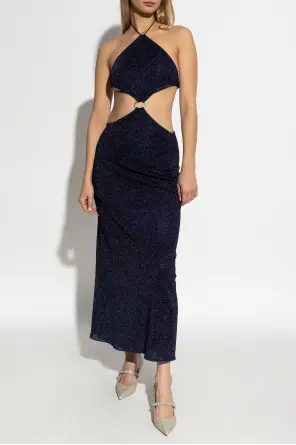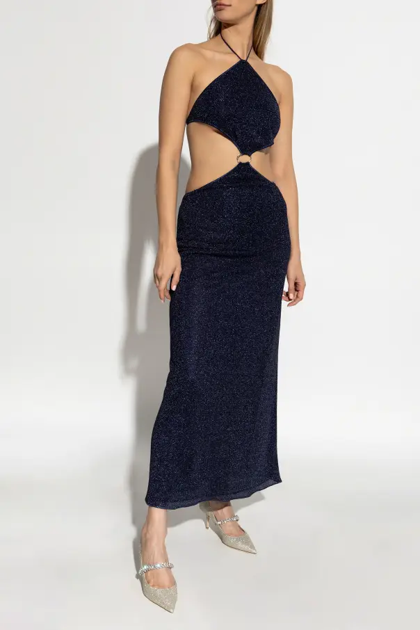 Introducing the Glitter Finish Dress by the illustrious designer Oséree. This navy blue masterpiece embodies elegance with its exquisite glittery finish, reflecting a subtle sheen that captivates the eye. The dress features a distinctive backless design with deep side cuts, accentuating the waistline.