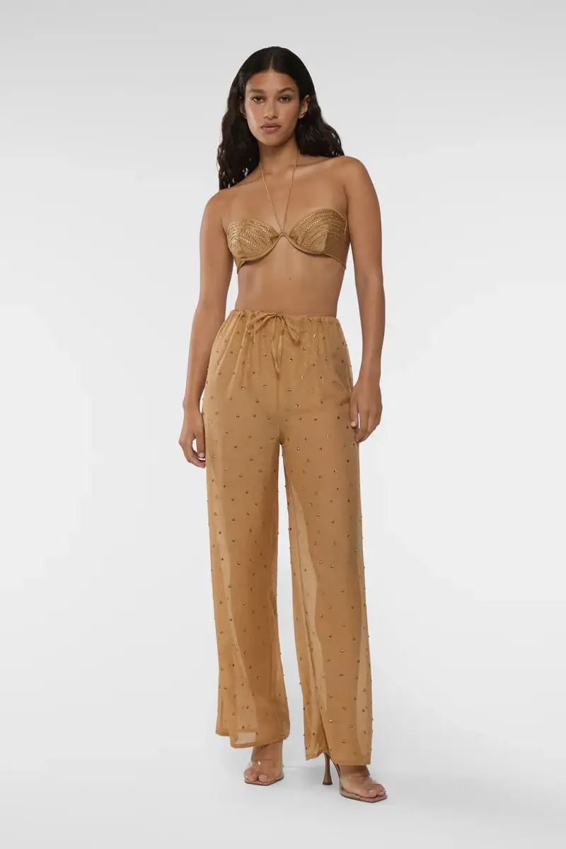 Made from a blend of silk and cotton, our SS24 Gem Pants seduce with a lace-up waistband, sheer for an ultra-luxurious evening or daytime look. Sparkling gems add a touch of glamour, making these pants perfect for special occasions.