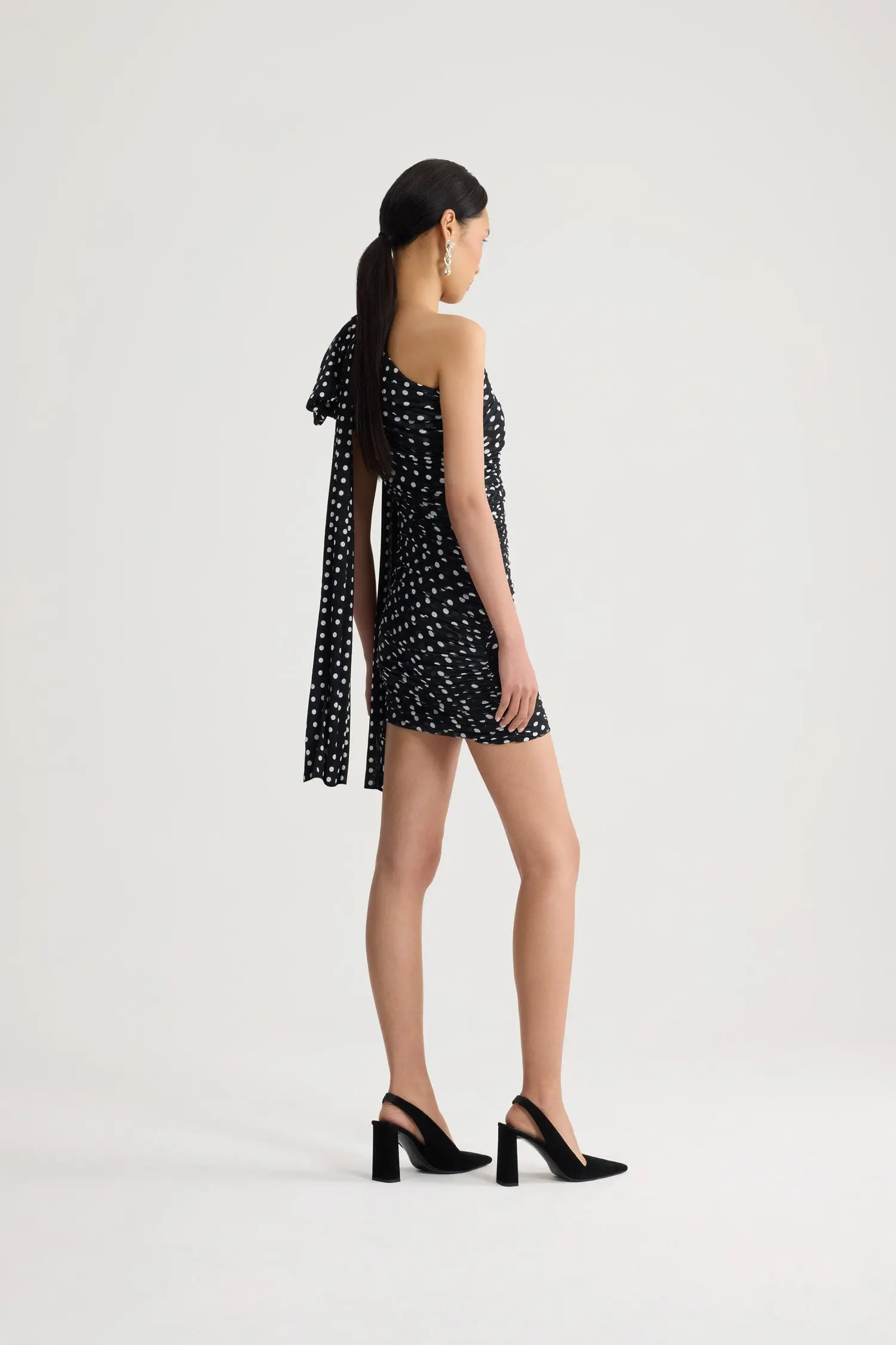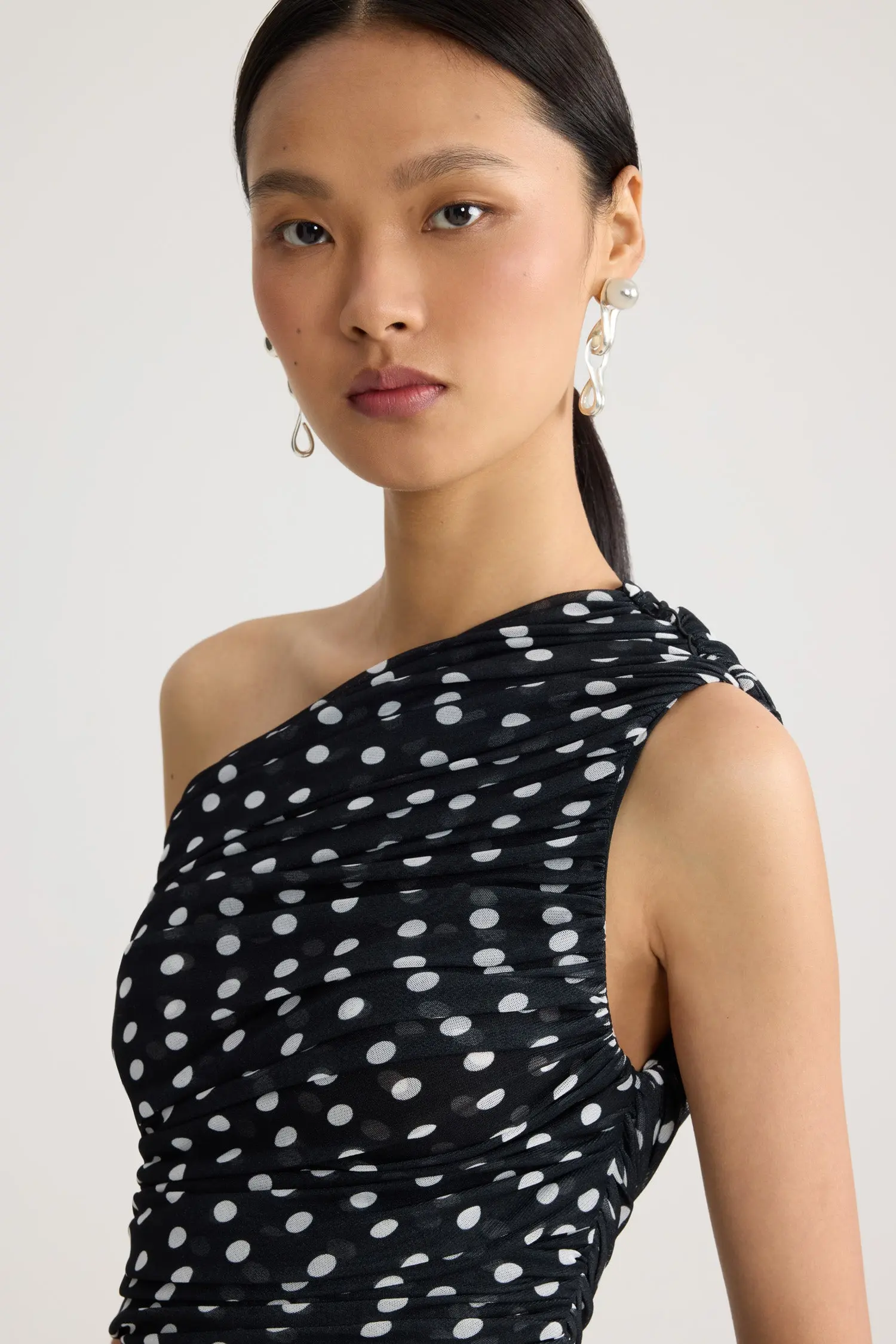 Black and white polka dot short dress. Recycled nylon material. Asymmetric cut. Long sleeves.