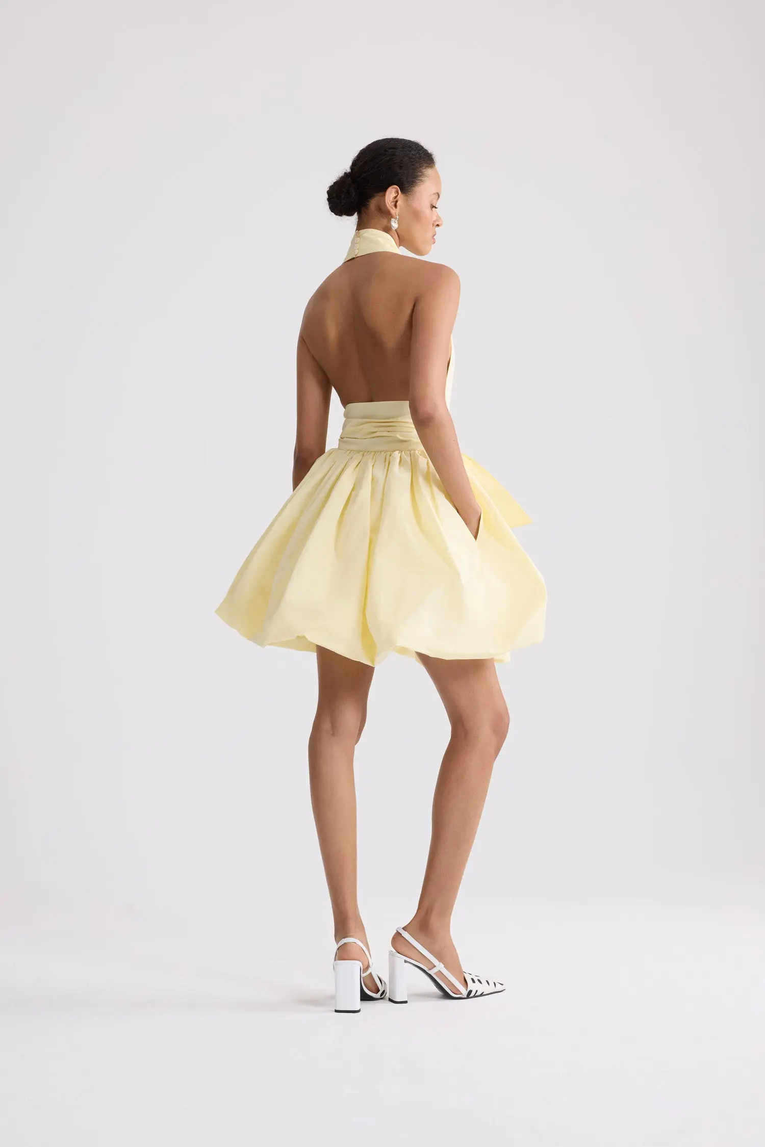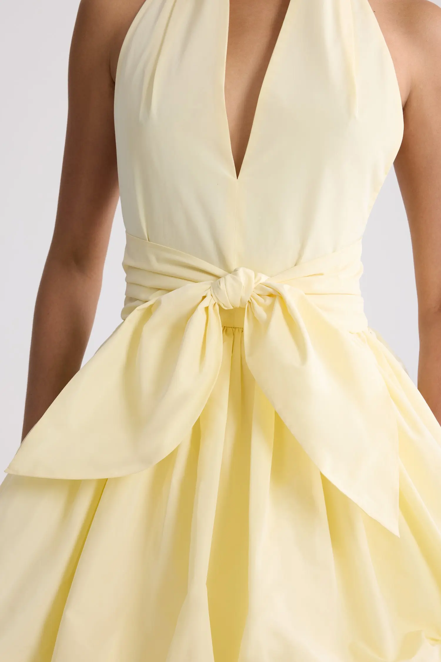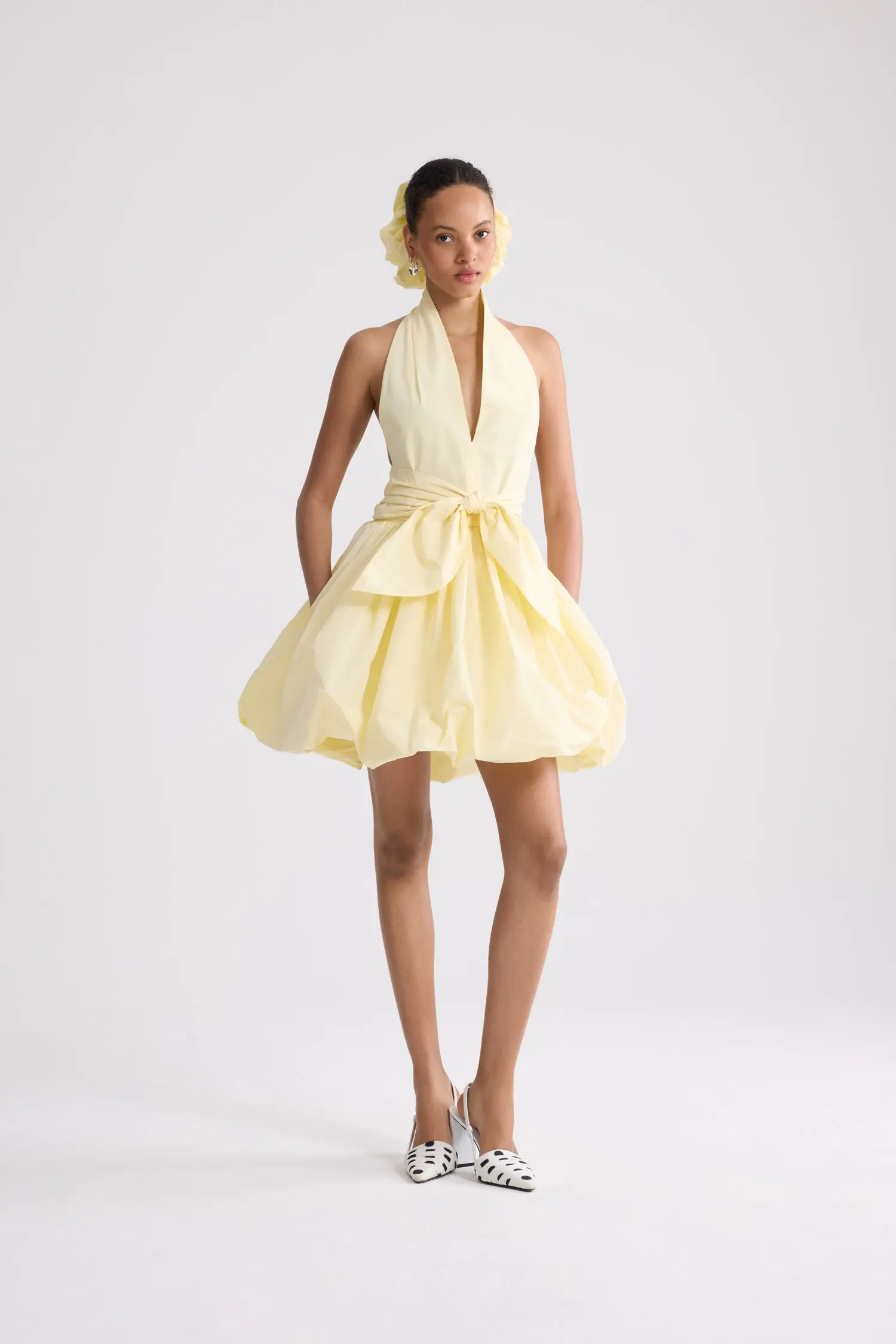 Knotted mini bloomer dress in yellow. Plunging V-neck. Knot detail at the waist.