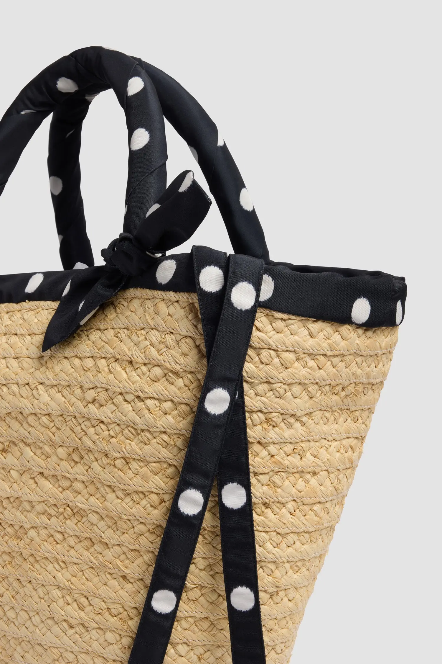 Large natural bucket bag. Raffia material. Black polka dot handles and ties.
