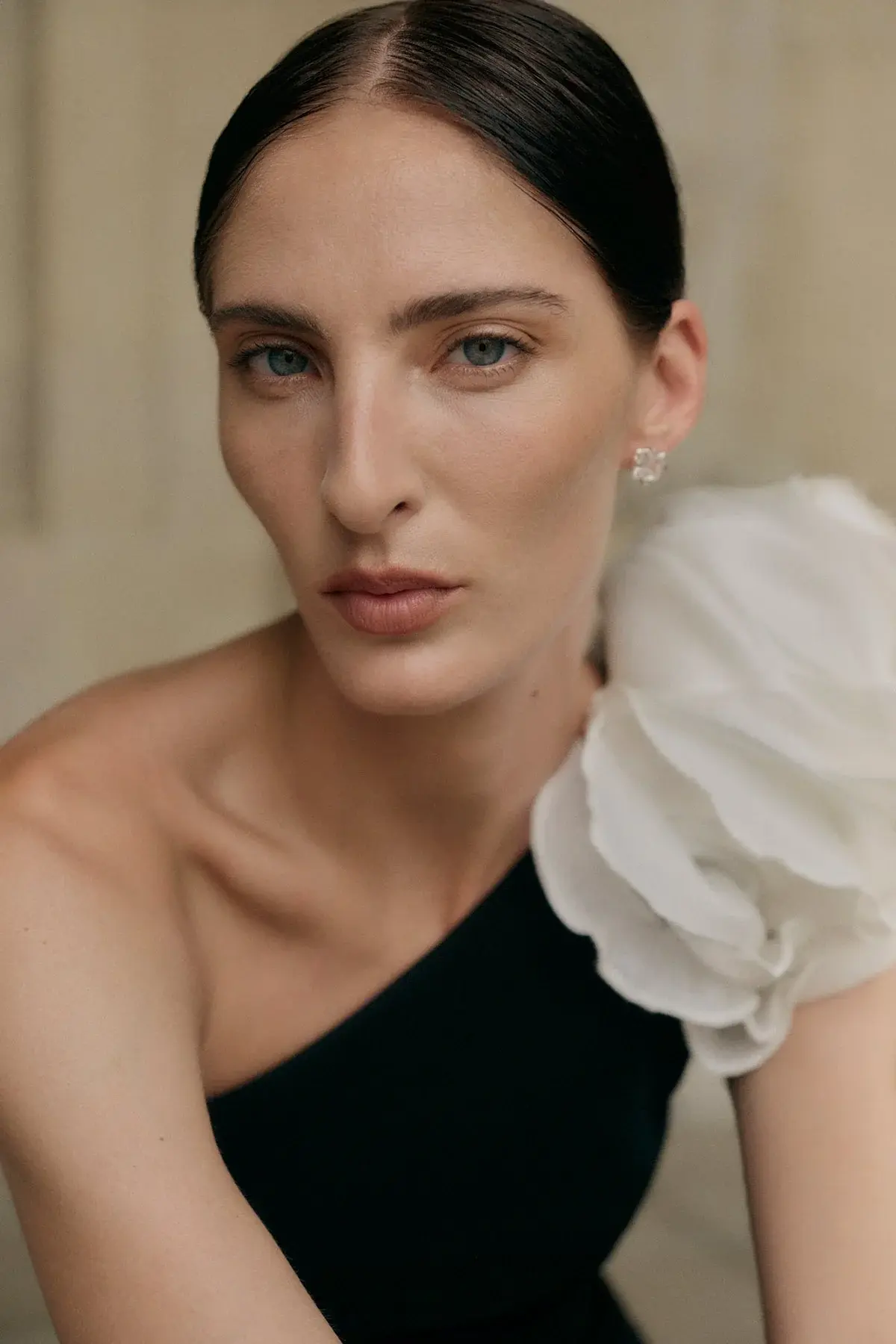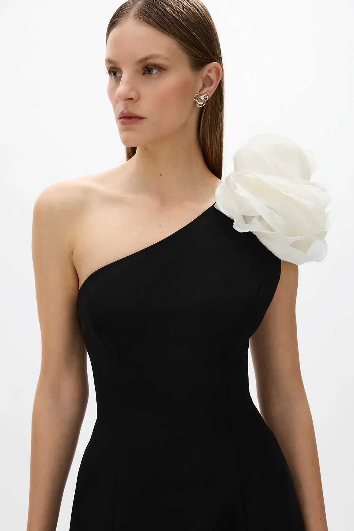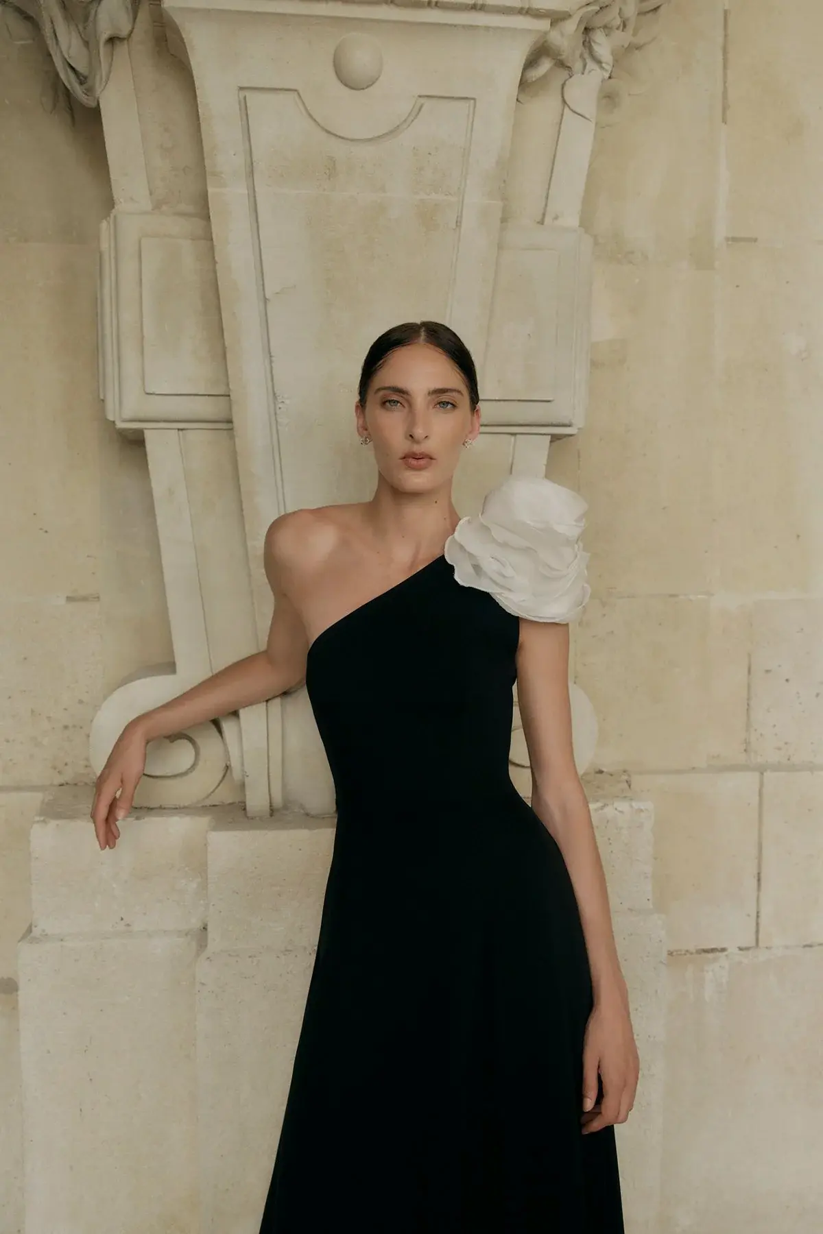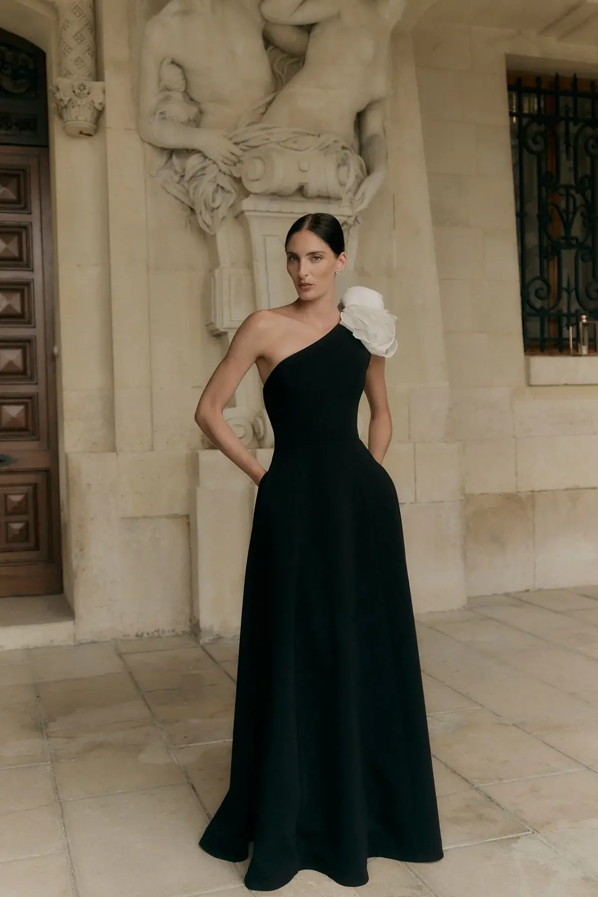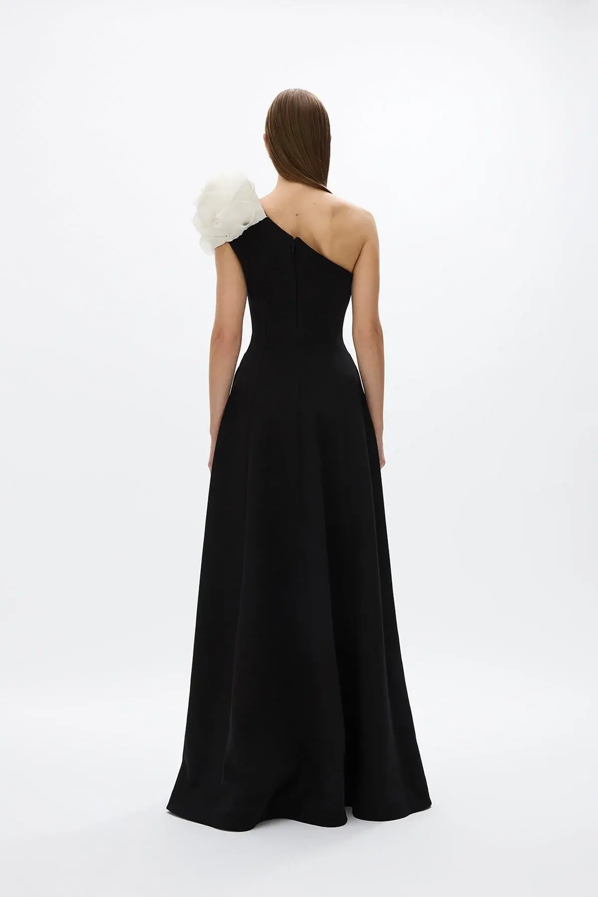 A one-shoulder gown complete with an A-line skirt. Detailed with the seasonal hand placed and sewn floral motif in a contrast soft ivory. The Vya gown features internal corsetry that creates a fitted waistline and defined hour-glass shape.