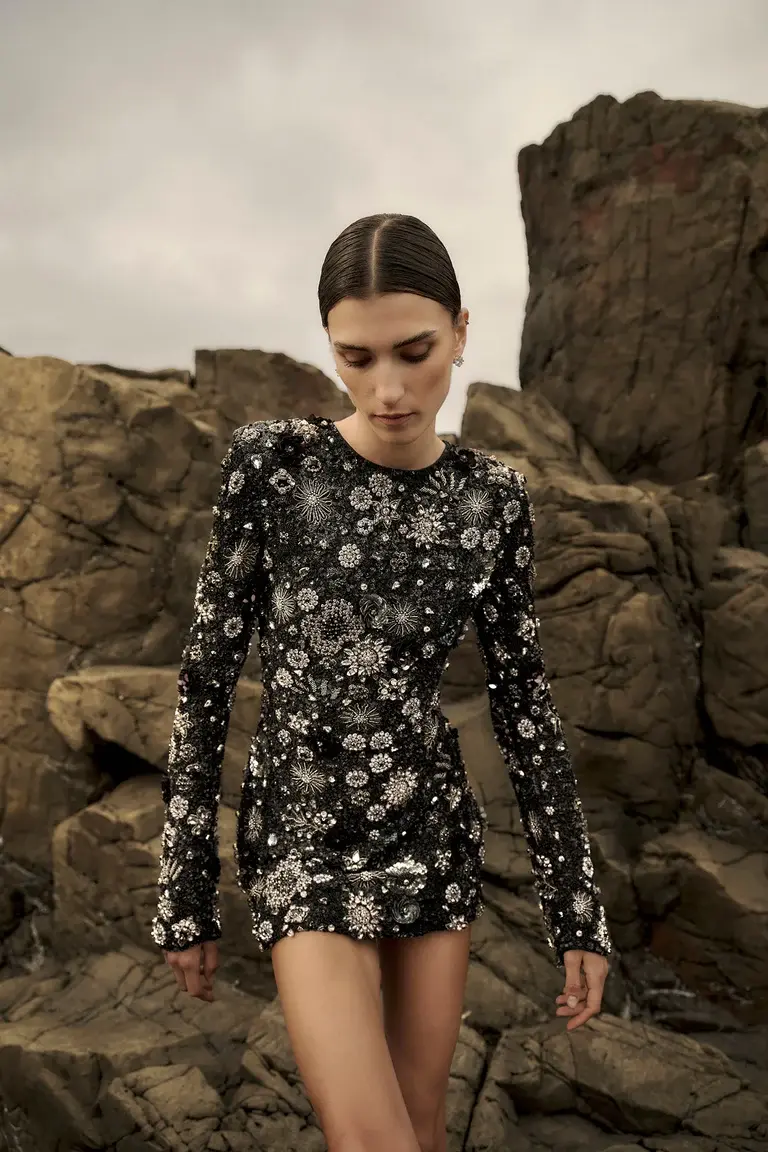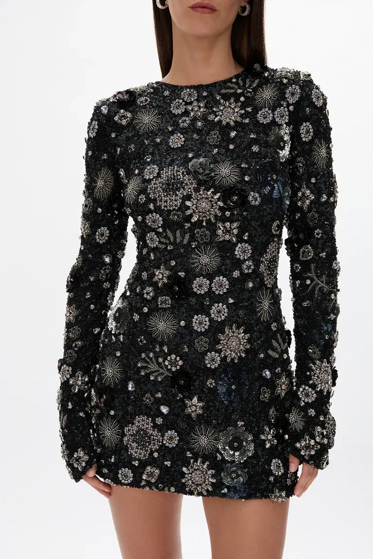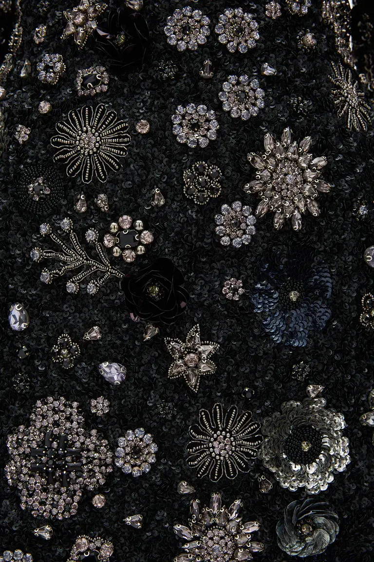 Hand embellished garment with densely sown glass beads and laser cut sequins