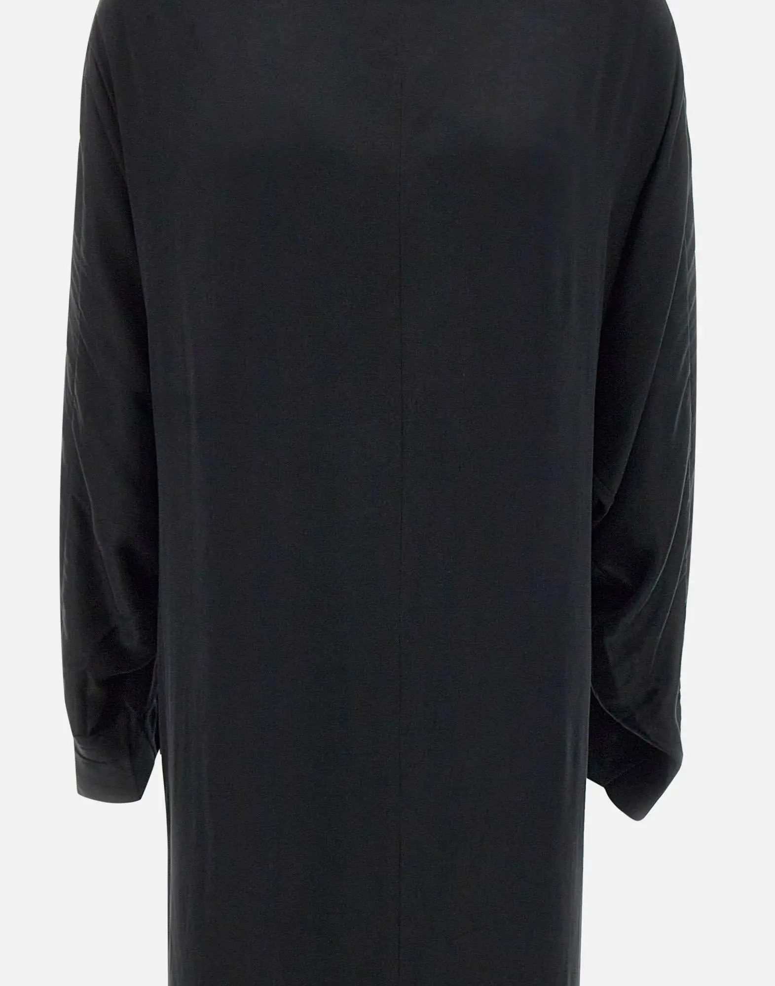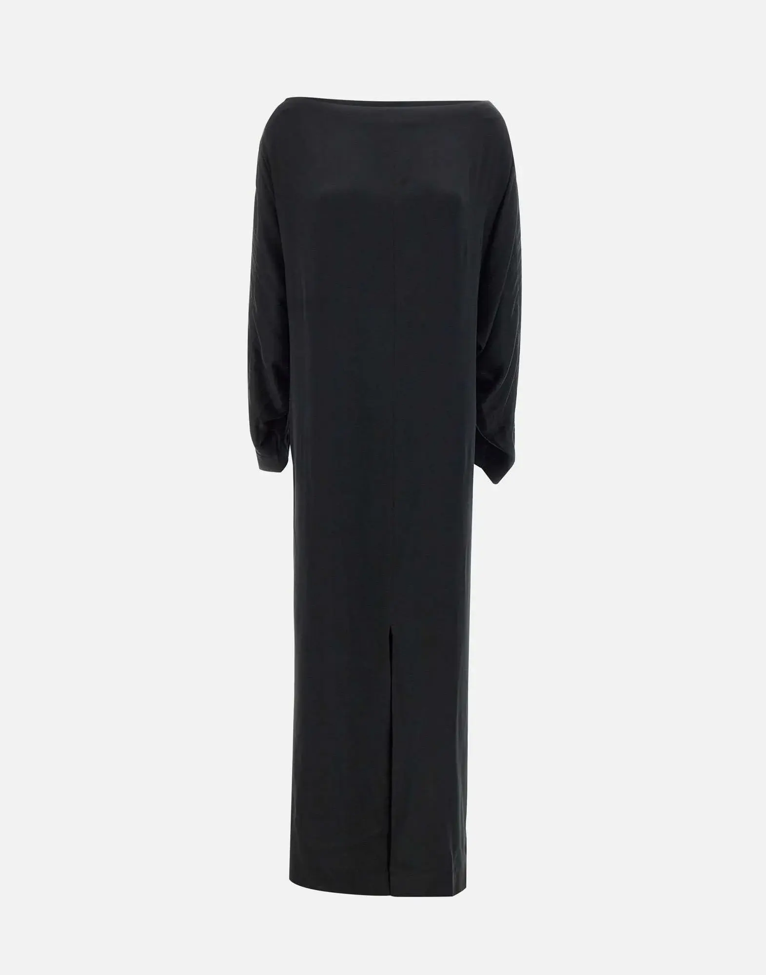 ‘Bat Sleeve Dress’ Remain Birger Christensen, black, Cupro and Viscose fabric, super soft, plunging neckline, bare shoulders, voluminous bat sleeves, maxi length, wide front slit for ease of movement, button fastening at back, relaxed fit