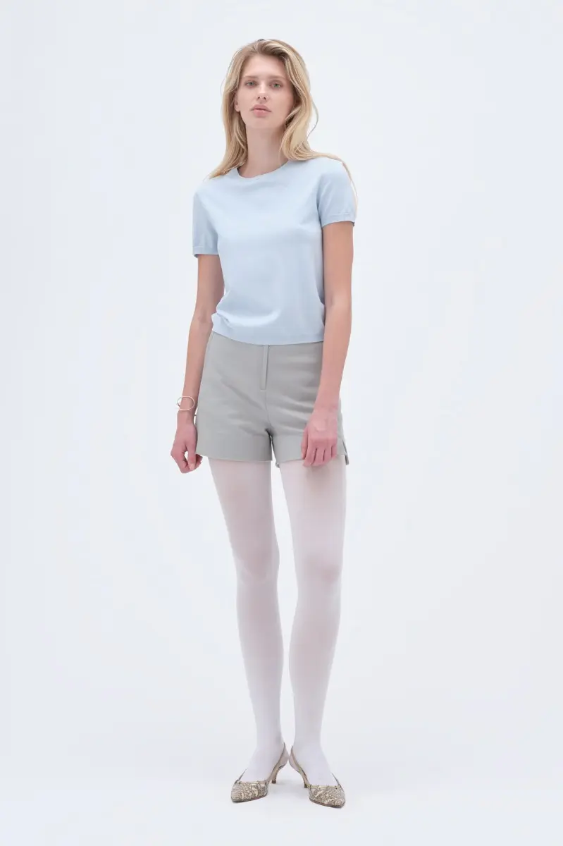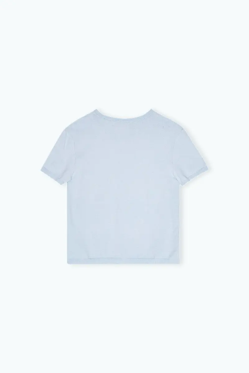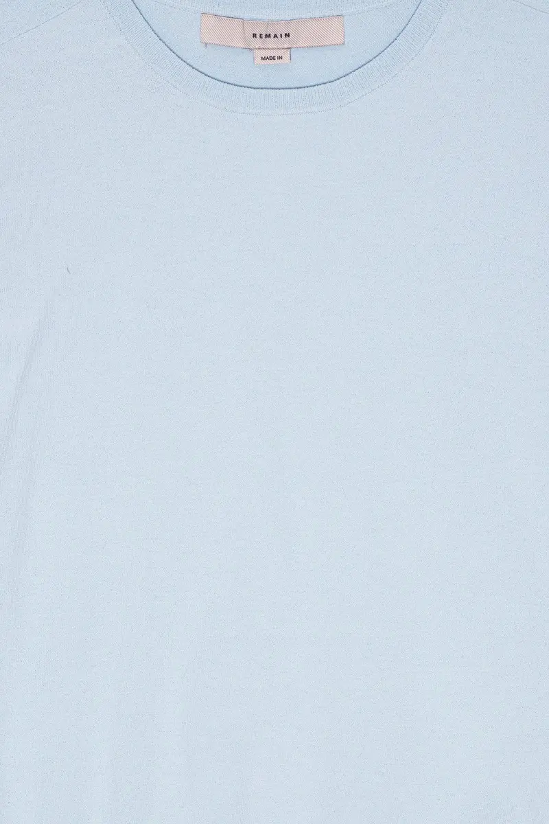 Knitted T-shirt Light Blue with a round neckline and short sleeves. This semi-fitted T-shirt features a lightweight knit structure, with a ribbed hem and sleeves for subtle detail. It has a classic straight-cut silhouette.