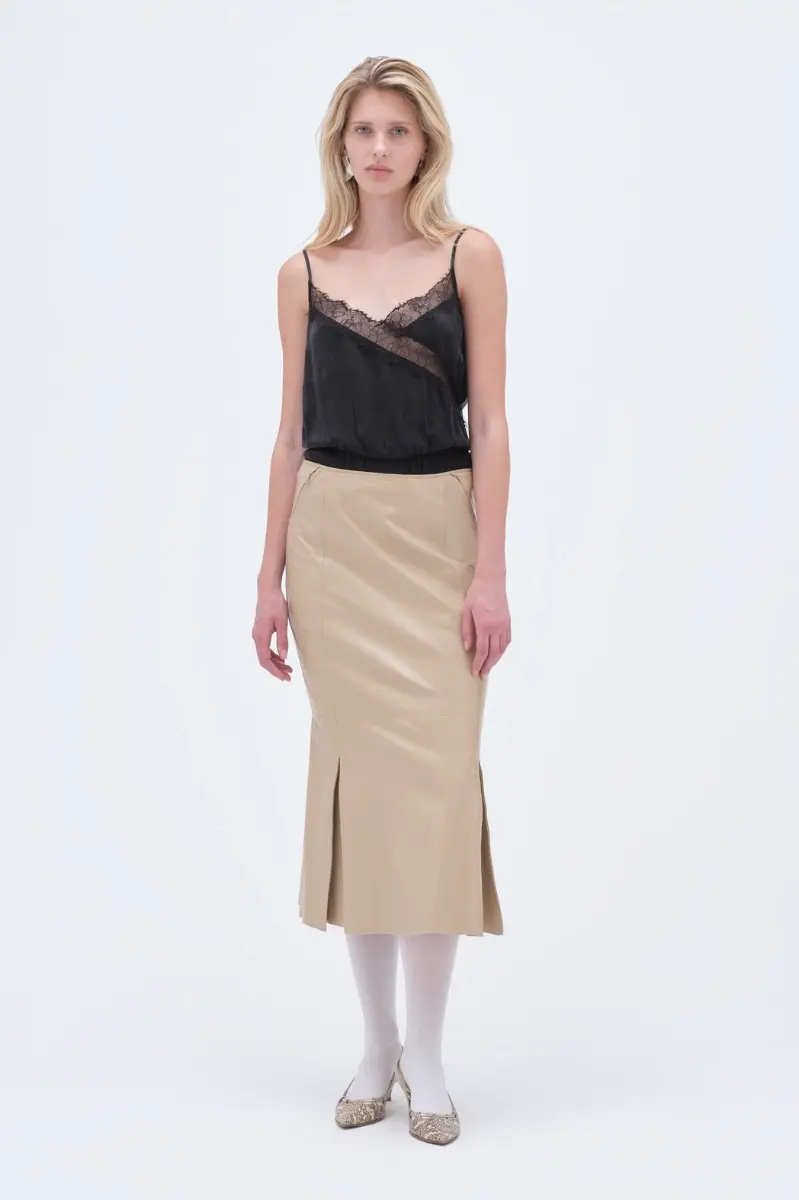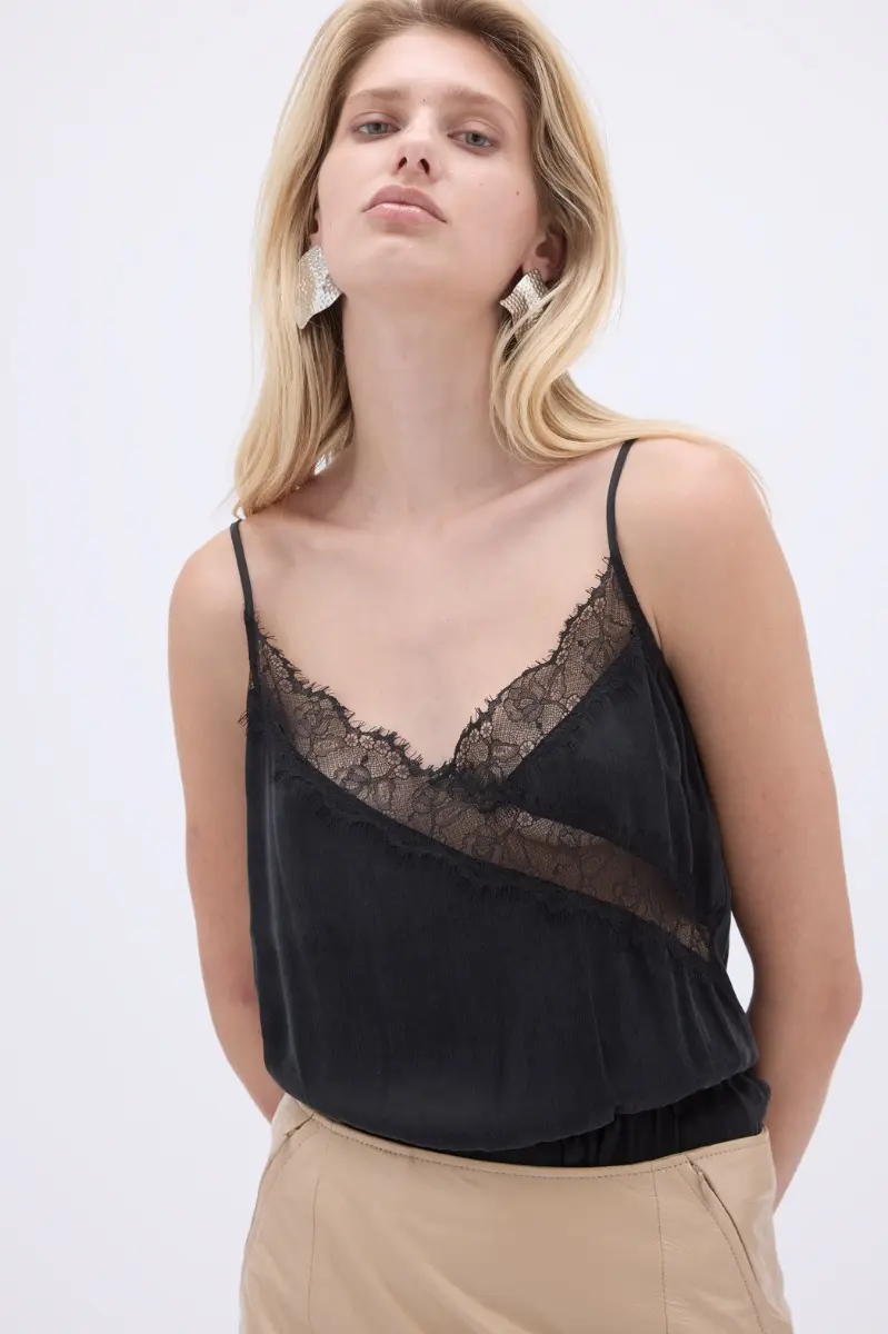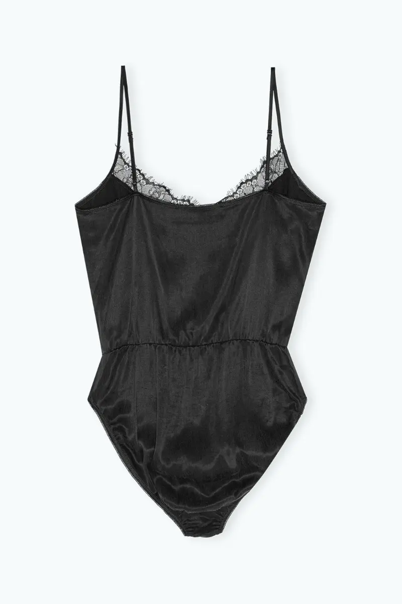 The Body With Lace Edge in Black features delicate lace trim along the neckline and across the front. Designed with adjustable spaghetti straps and an elasticated waist, this fitted bodysuit has a soft, fluid texture and snap closures at the bottom.