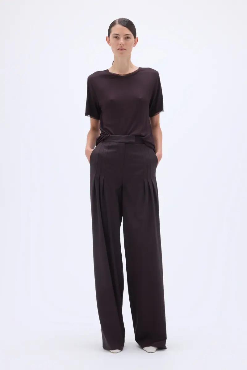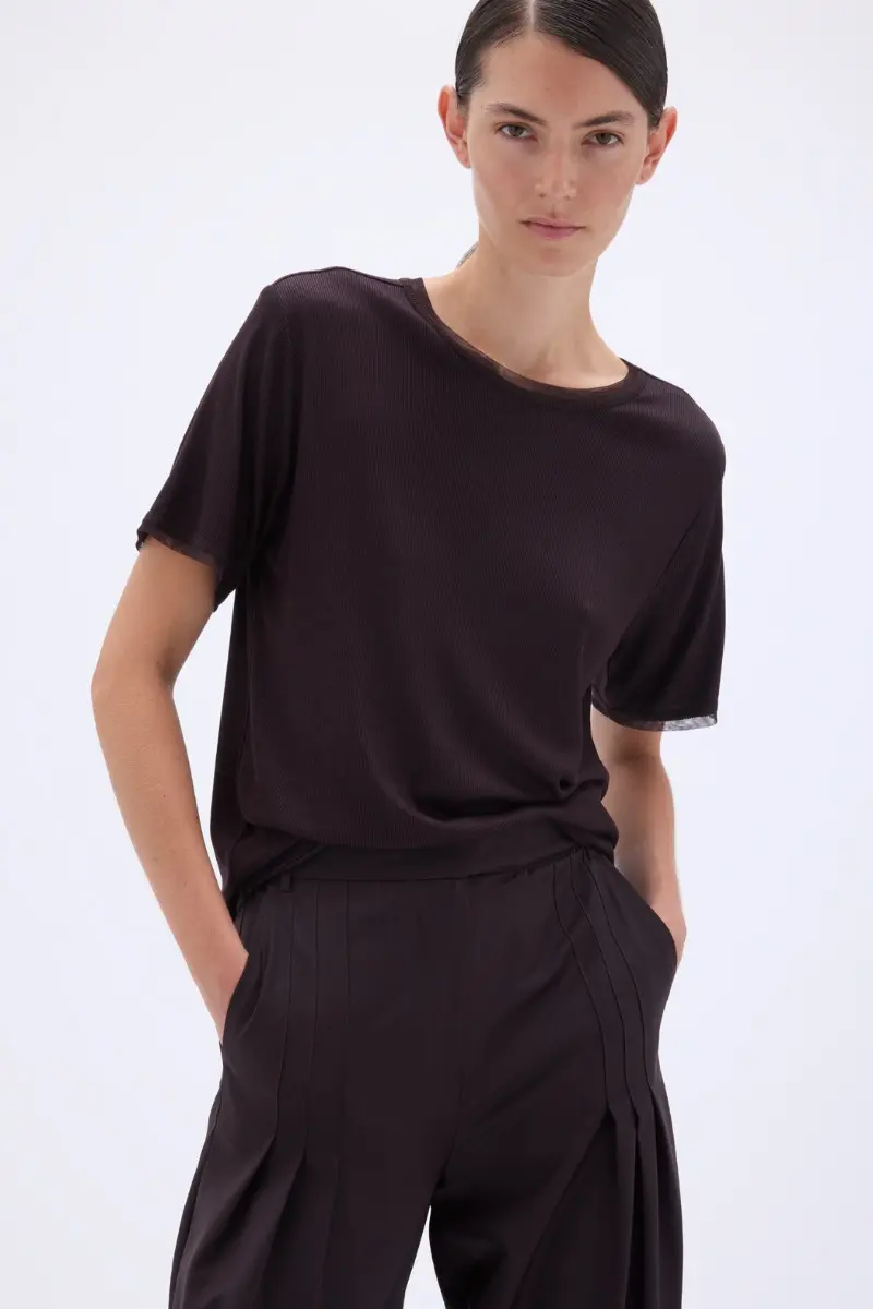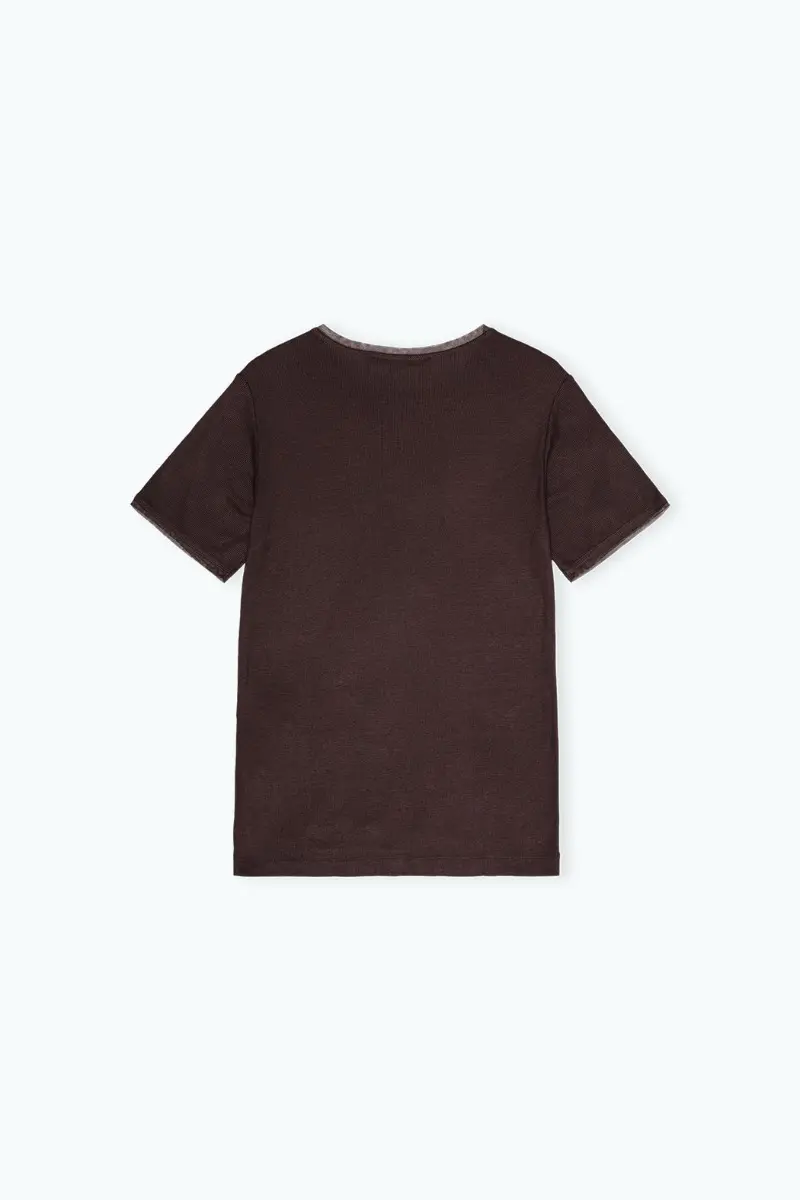 The Mesh Trim T-shirt Dark Brown is a short-sleeve T-shirt with a round neckline and subtle mesh trim along the collar and sleeves. This relaxed-fit style offers lightweight comfort, and the clean hemline ensures a simple finish.