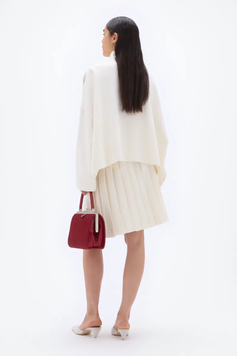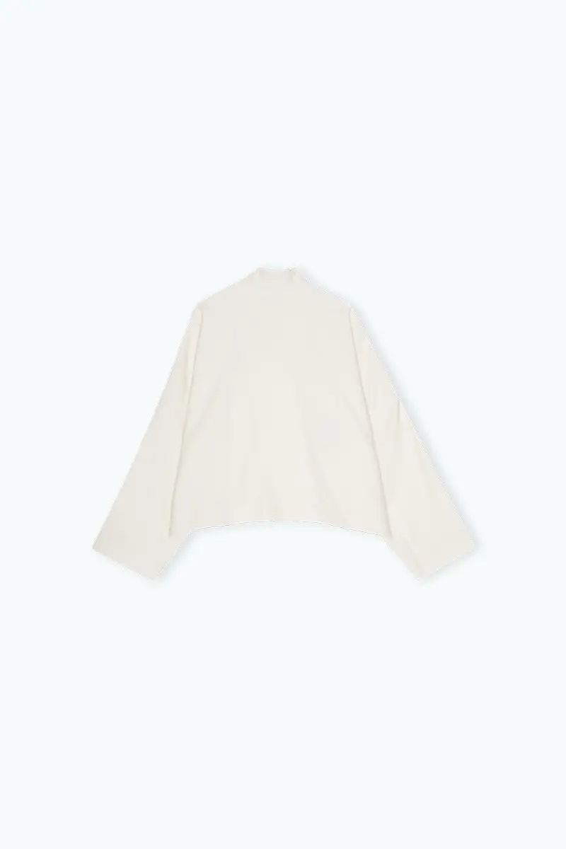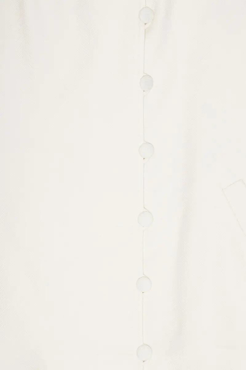 The Suiting Jacket Creme features a high collar with a hidden front zip closure and an adjustable belt at the waist. The jacket has wide sleeves and a relaxed fit, offering structured shoulder panels. Back vent included for ease of movement.