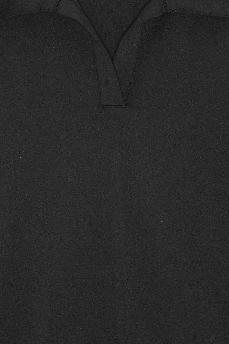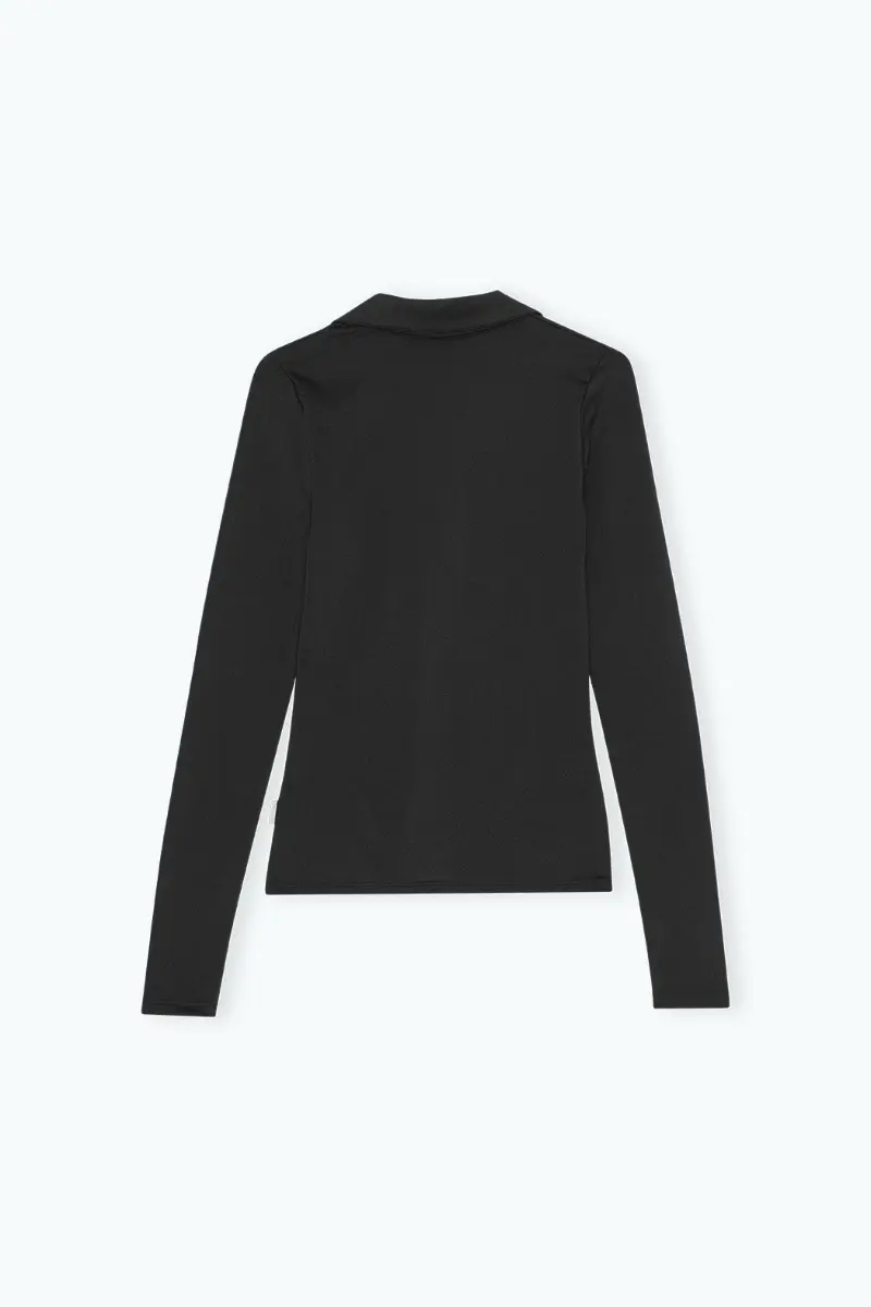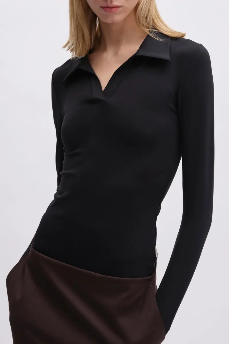 Jersey Polo Top Black is crafted from a smooth stretch jersey and features a fitted silhouette with long sleeves. Designed with a pointed collar and an open V-neckline, it offers a sleek and minimal appearance. The clean hem and simple seams enhance the refined finish.