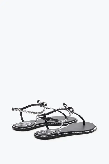 The timeless elegance of black meets the versatility of a flat in the Caterina sandal. The three crystal-studded bows, a stylistic feature of this model, give a romantic and refined allure, perfect for walks along the seafront and evenings under the stars.