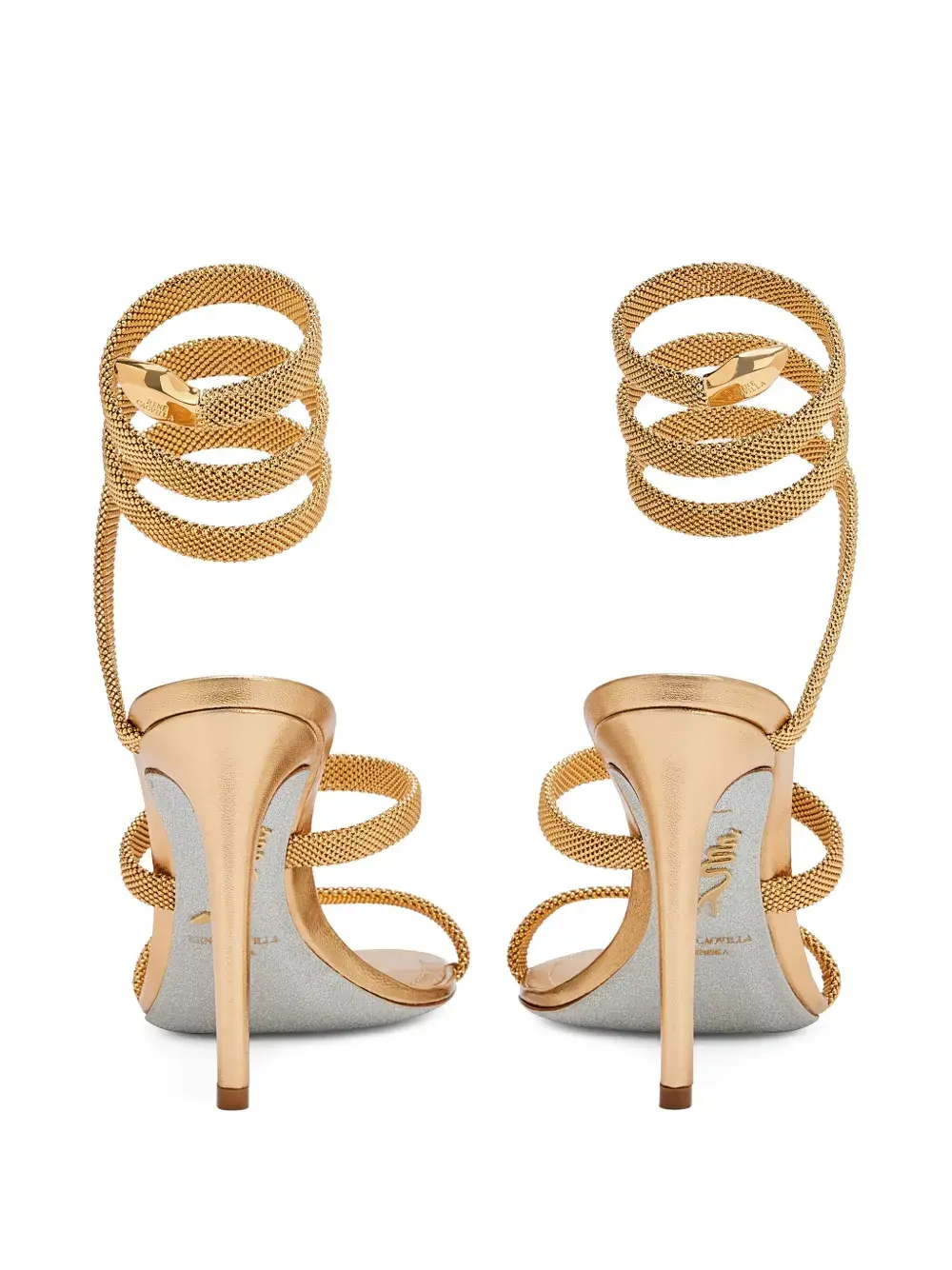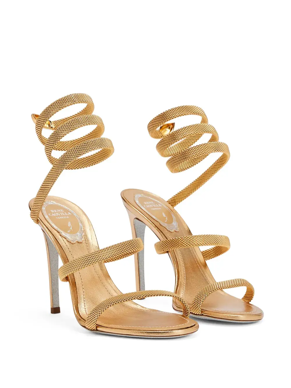 The Cleo sandal is an icon to wear. Made in Italy, it features a double ankle strap and a serpente pattern that delicately encircles the ankle and leg, all covered in rhinestones. Finished in a precious gold tone, it has a refined stiletto heel and the signature stardust sole.