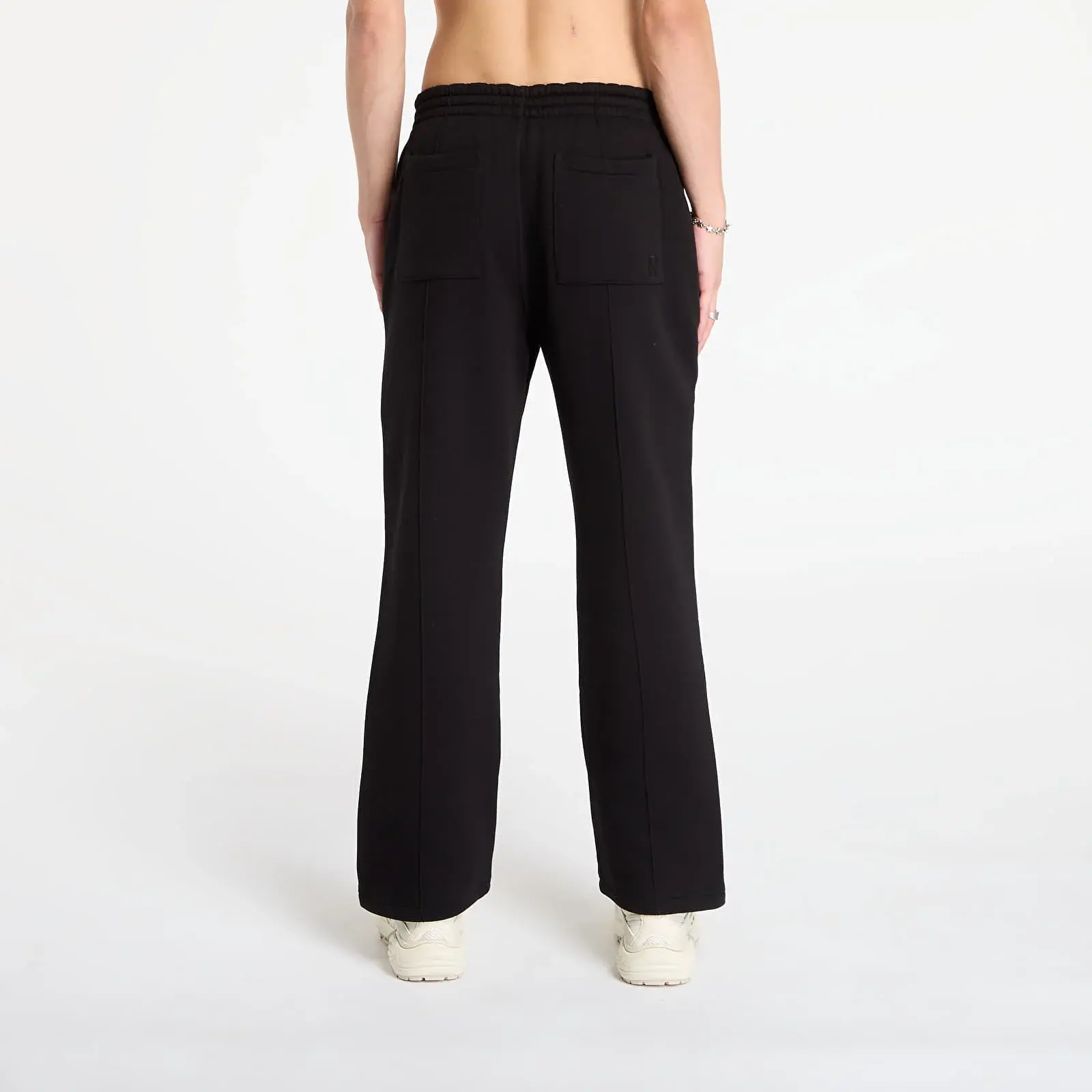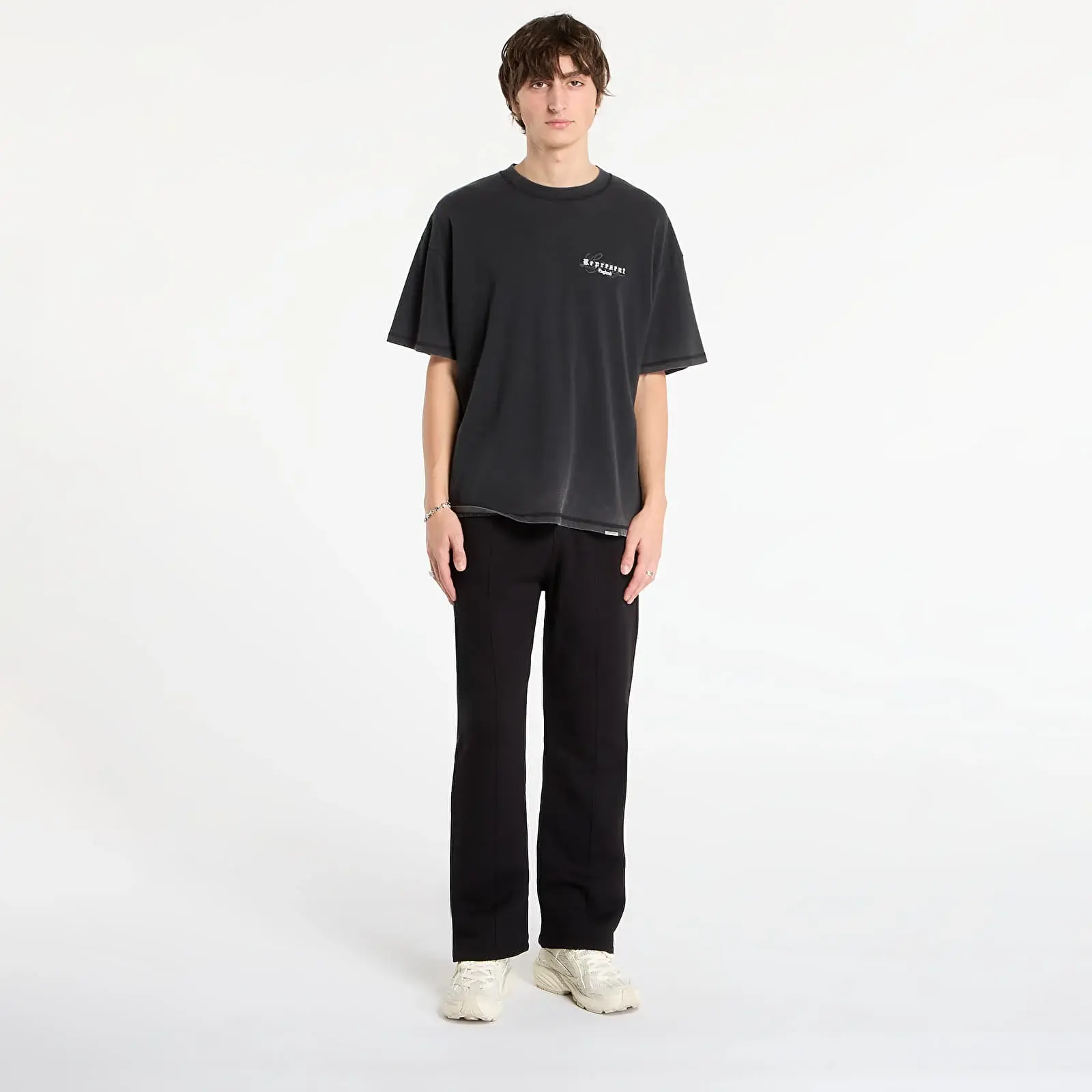 The Initial Sweatpants in black are crafted from heavyweight (500gsm) brushed loopback organic cotton. They are a wide leg style with a pintuck detail to the centre front. The sweatpants have an elasticated waistband with a 1x1 internal rib and natural hue internal drawcords. They are finished with split hems, an embroidered Initial to the back pocket and Represent metal bar to the side seam pocket opening.