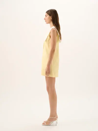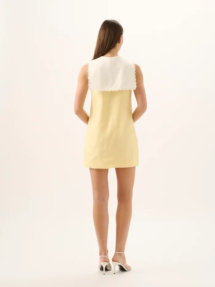 Rendered in soft Limoncello linen, the Valentina Mini Dress feels both nostalgic and refined. A sharp V neckline is framed by an exaggerated lace-trim collar, falling into a gentle A-line silhouette with a front button placket.