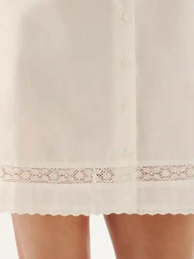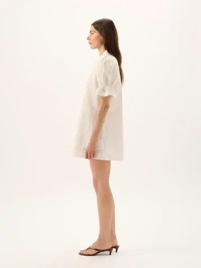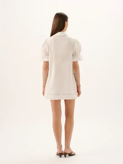 Crisp in white cotton, the Maisie Mini Dress feels fresh and quietly romantic. A V neckline and exaggerated collar with tie detail frame the silhouette, balanced by gathered sleeves and delicate lace trim throughout.