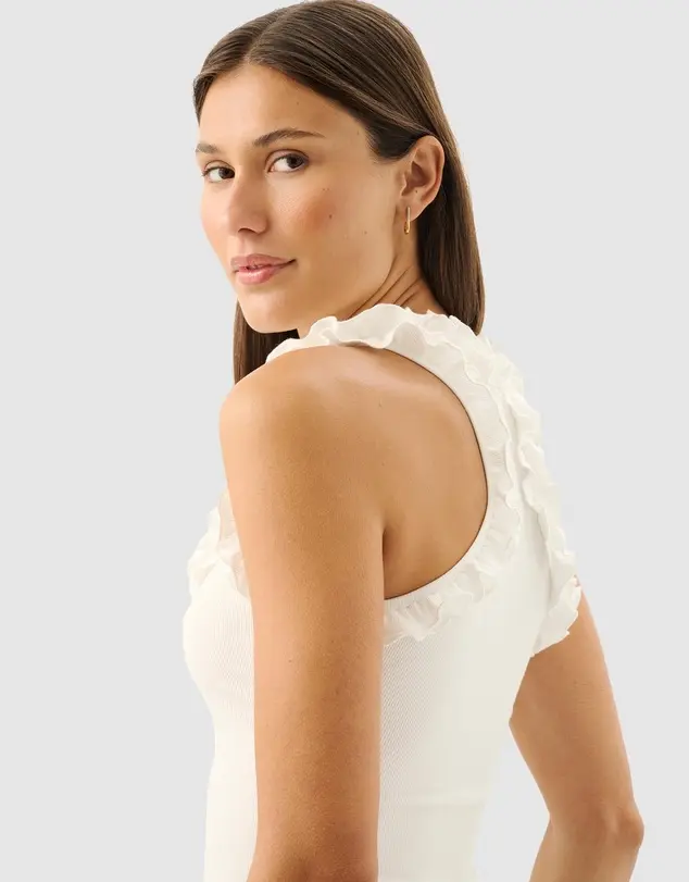 The Paloma Tank by ROAME. showcases feminine details with a scoop neckline trimmed by a double-layer ruffle and a racerback cut. Made from a fitted ribbed fabric, this refined staple puts a contemporary spin on the timeless tank.