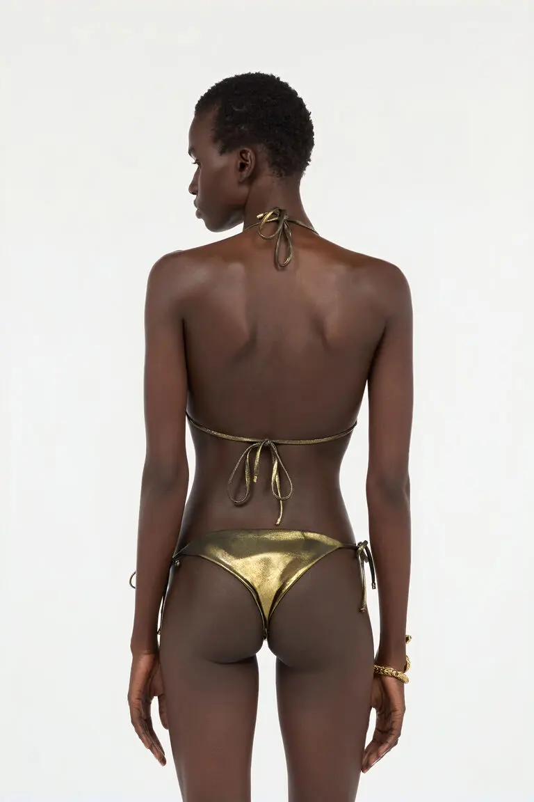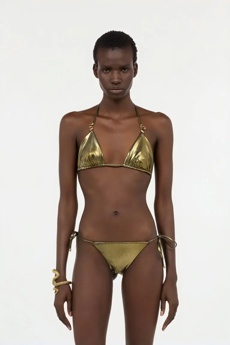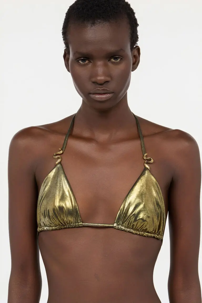 Details Metallic-finish bikini top Metal snake accents with engraved detailing Tie-back closure with adjustable strings
