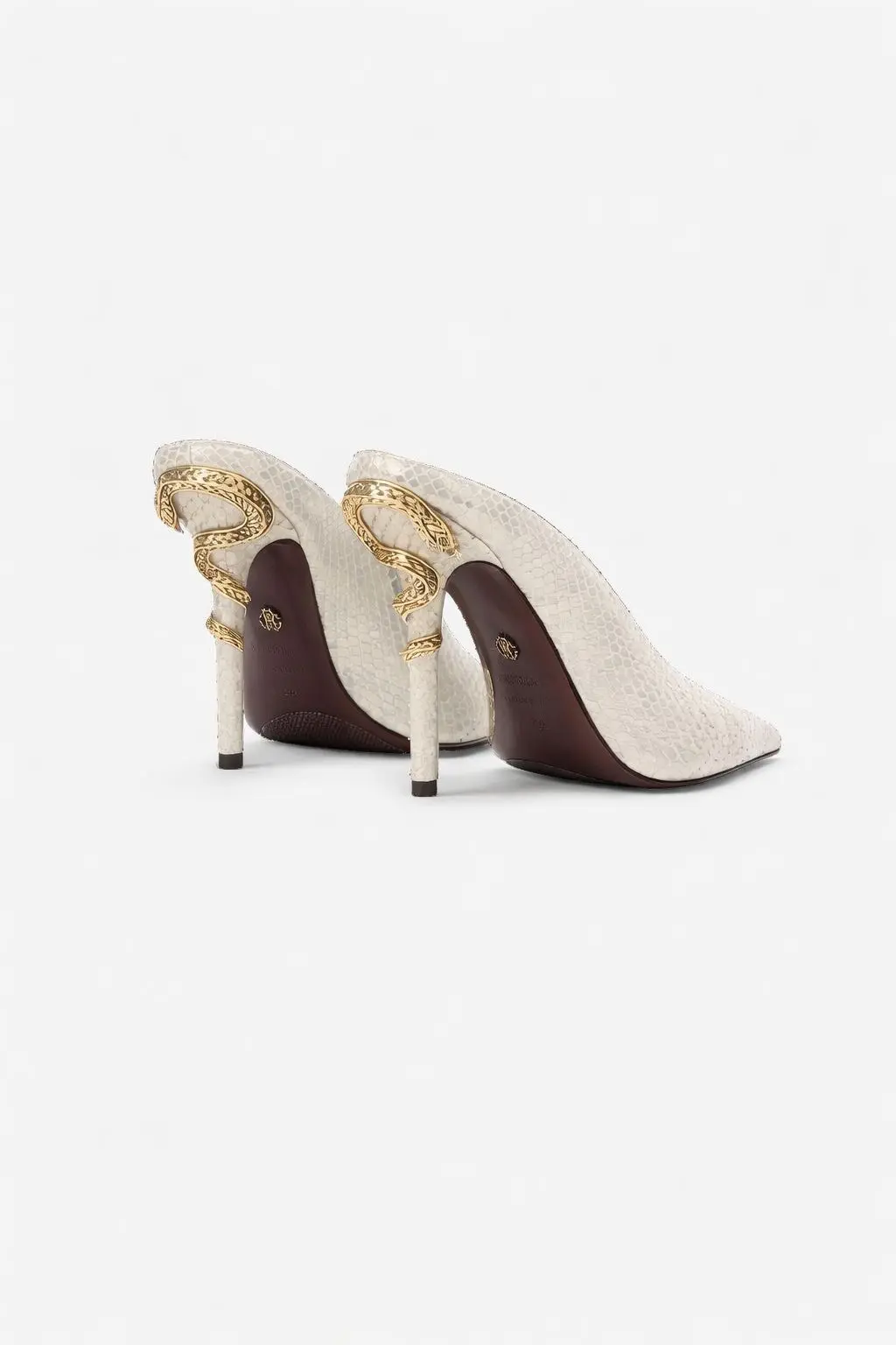 Roberto Cavalli continues to reinvent his iconic codes with a pair of mules featuring an innovative pointed construction inspired by classic pumps, distinguished by an all-over python scale effect. As a further tribute to the reptile world, the style is finished with a small engraved metal snake that wraps sinuously around the high stiletto heel. The design is completed by the Roberto Cavalli label on the insole and a small RC Monogram applied to the outsole.