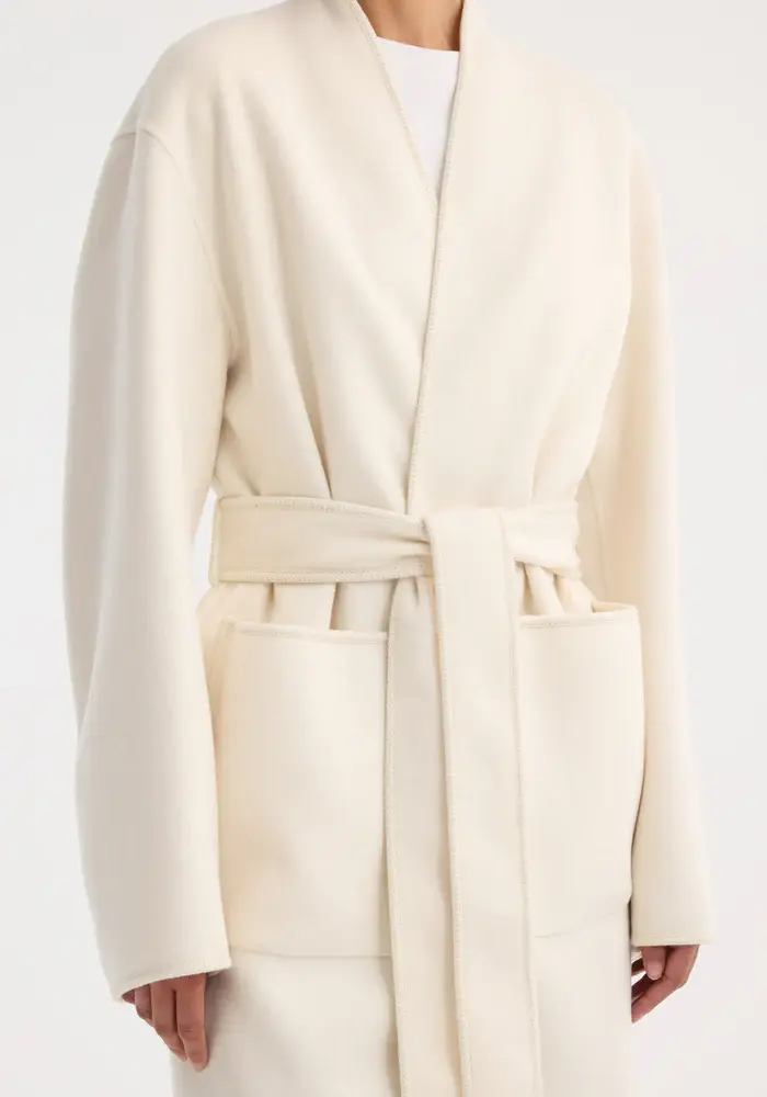A timeless wrap coat with a clean kimono-inspired cut and minimalist detailing. Designed with patch pockets and a self-tie belt for an adjustable silhouette.