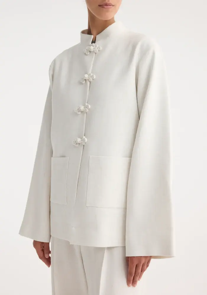 The signature Róhe 'Marie' jacket is now reimagined in a beautiful seasonal white tone crafted from a silk viscose blend. Wide sleeves and traditional pankou closures bring an elevated elegance to the standout design. Patch pockets and a flowing silhouette make it as functional as it is striking.