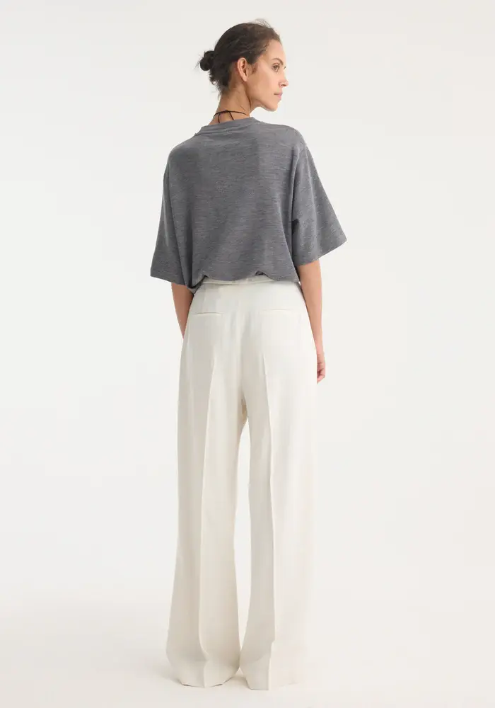A relaxed fluid trouser crafted from a crisp light silk blend fabric. Designed with a wide leg silhouette and an elegant drawstring waistband for comfort and effortless movement. Understated tailoring for everyday ease.