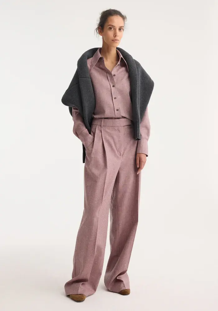 - Mid-waisted, tailored waistband, double pleated, tweed structure