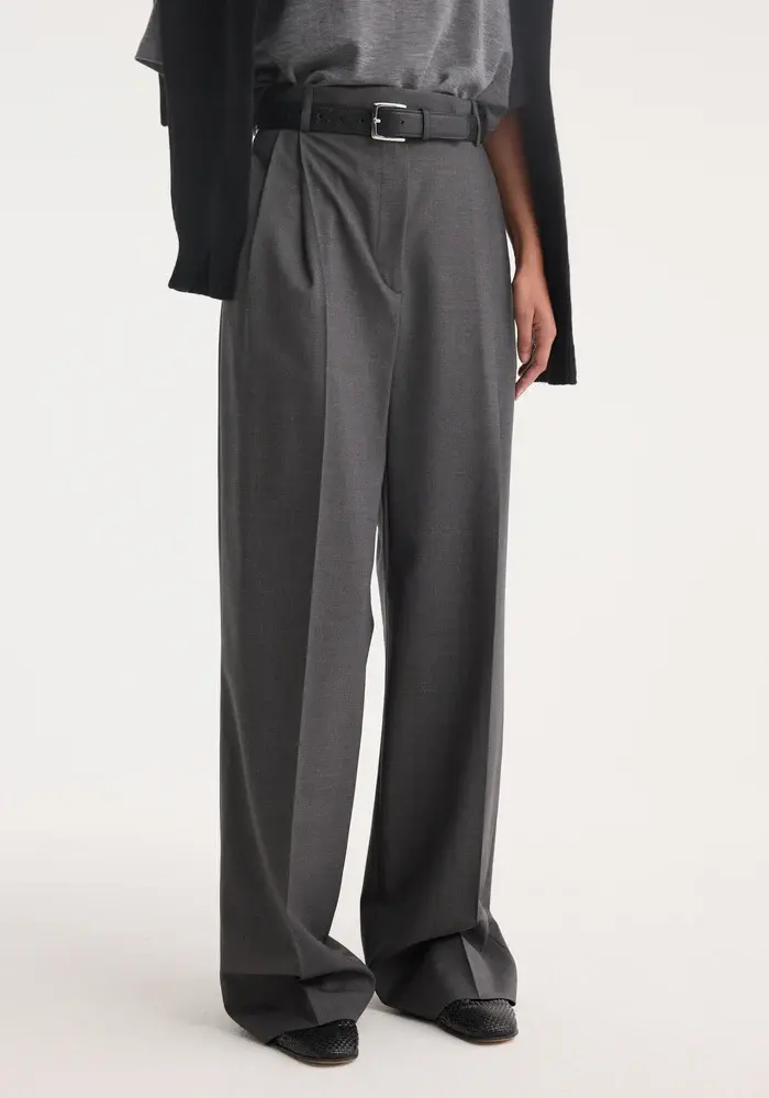 - High-waisted, front and back pleats, tailored waistband, welt back pockets