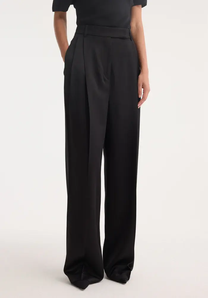 High-waisted trousers crafted in satin. These trousers feature front and back pleats and welt pockets, for a structured silhouette and a polished finish. They are a versatile wardrobe staple for any occasion.