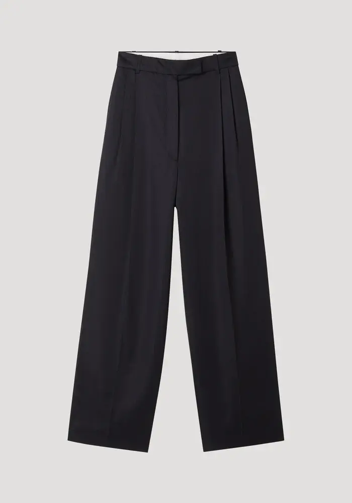 - High-waisted, front and back pleats, tailored waistband, welt back pockets