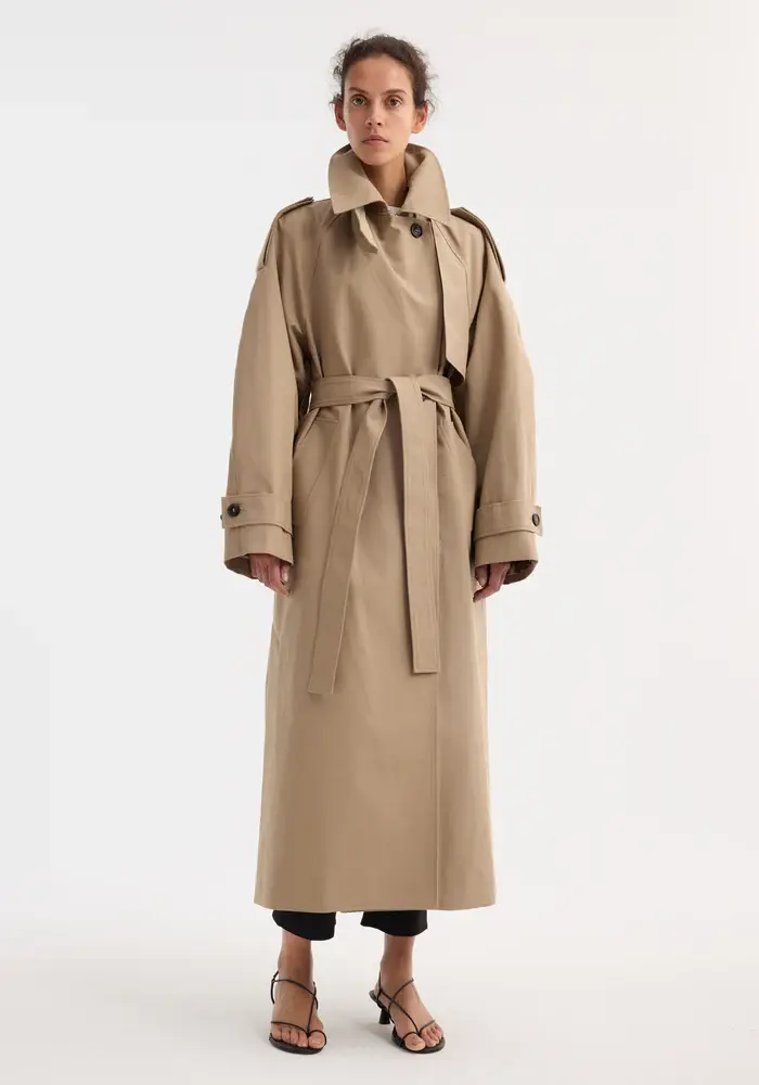 Our take on the classic trench crafted from a high-quality dense cotton fabric with structured design details and an oversized full-length silhouette for modern elegance.