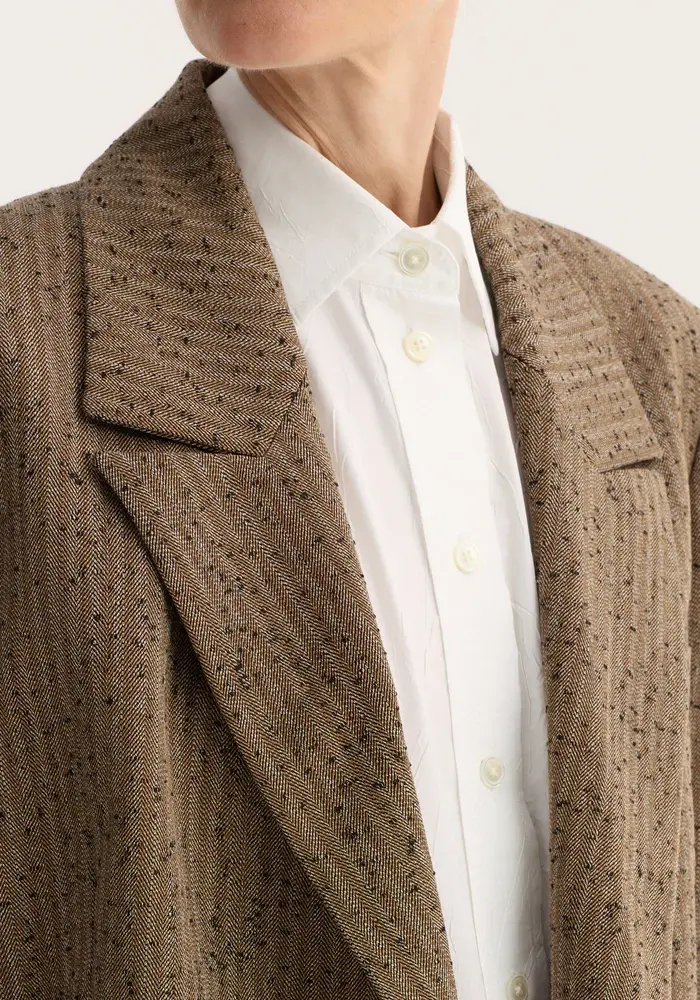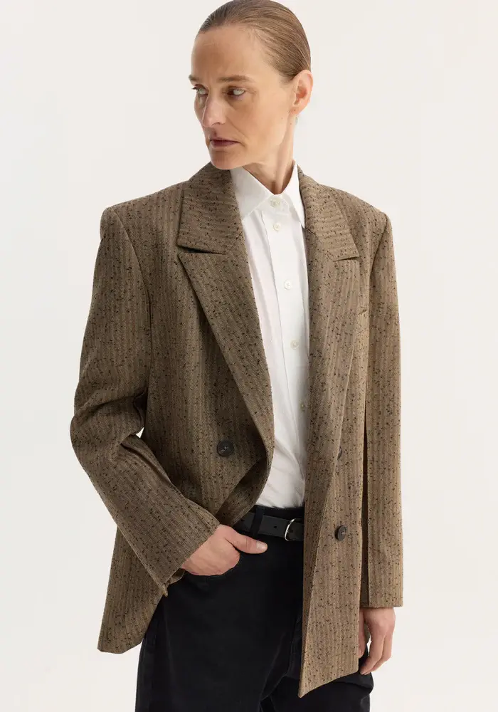 A double-breasted blazer tailored from a soft herringbone-textured fabric, defined by clean lines and a sharp, tailored shoulder line. Finished with a chest pocket, welt pockets, and fine sleeve seams for a refined silhouette.