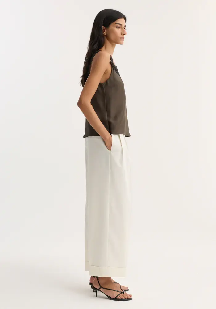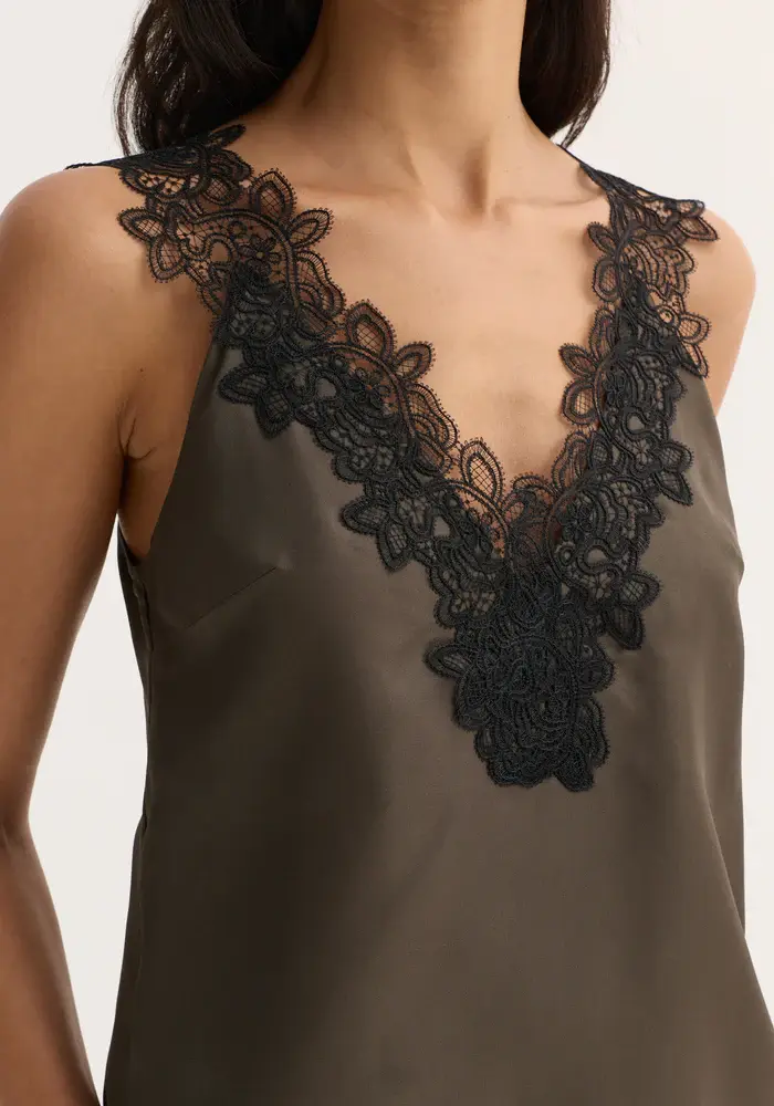 A silk camisole with lace straps that shape a V-neckline for an elegant, refined finish.
