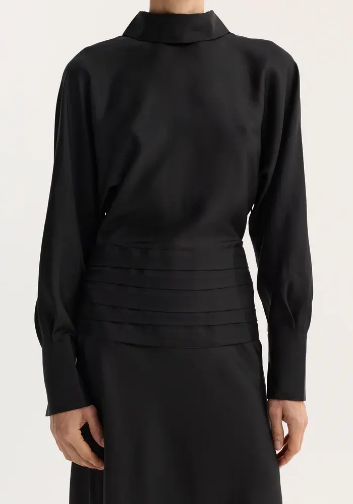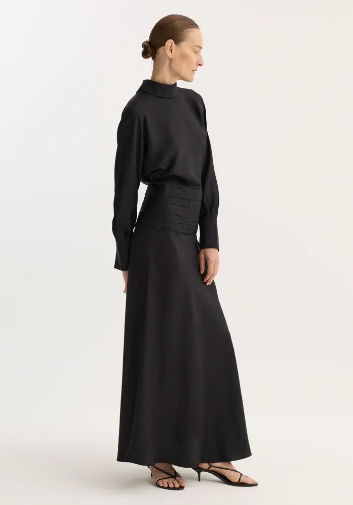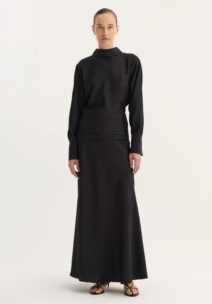 A full-length silk dress with flowing sleeves and a high collar. The waist is defined by cummerbund detailing, secured at the back with covered buttons. A reversed collar reveals an open back that extends to the waist, finished with a side zip for ease.