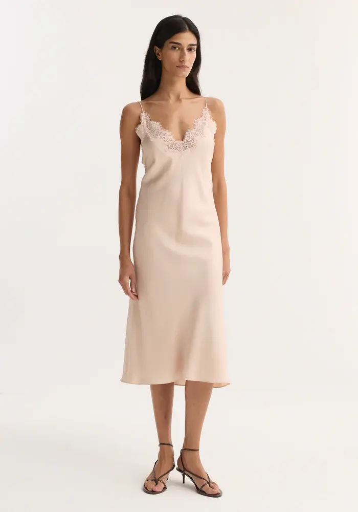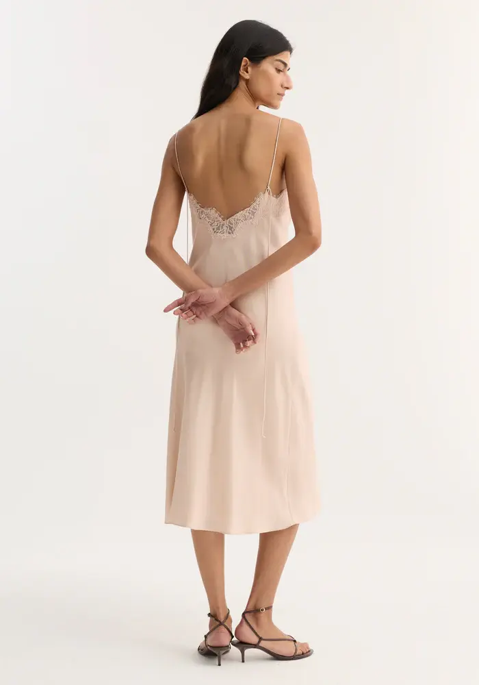 A lightweight silk camisole slip dress featuring delicate lace detailing along the neckline and back, finished with elongated adjustable straps that fall down the back of the garment.