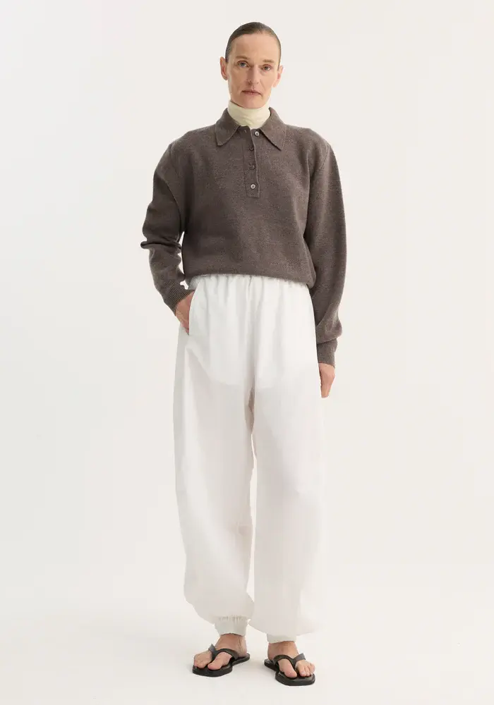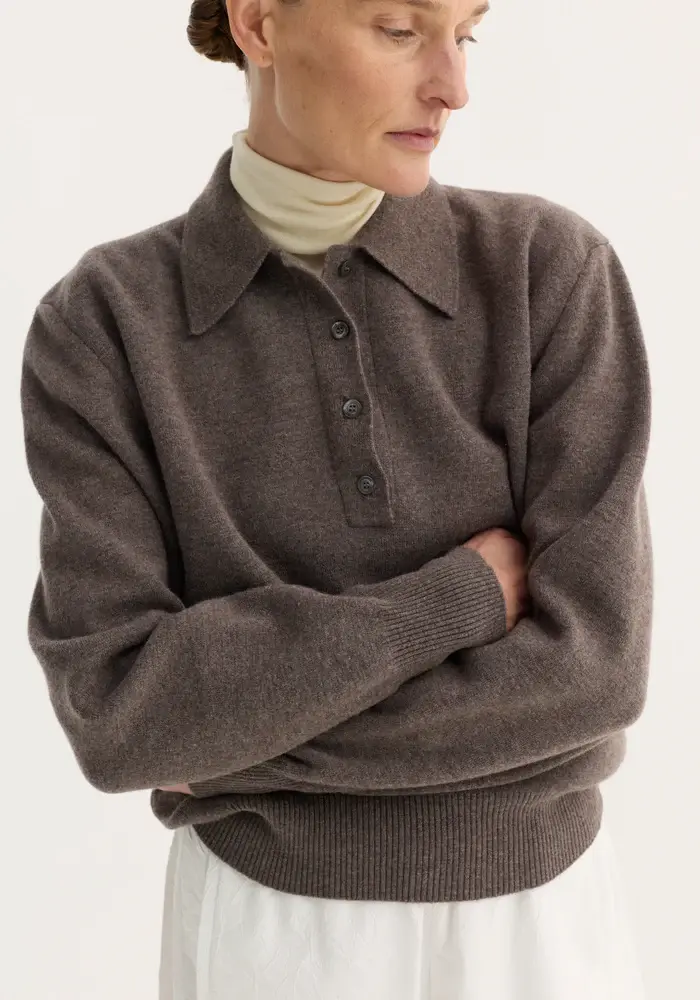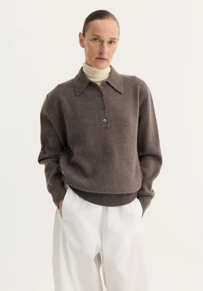 A relaxed polo knit crafted from a soft wool–cashmere blend. Designed in a compact knit with a structured collar and three-button front closure for a timeless look.