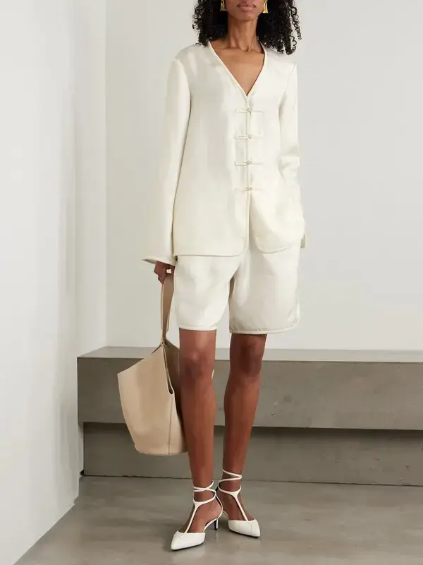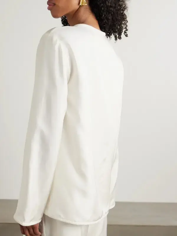 - Soft silk, relaxed fit, embroidered edge, pankou closure