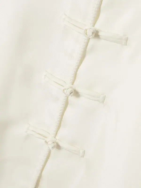 Silk top with pankou knot closures, a fastening detail with deep roots in traditional Chinese garment construction. Embroidered edges add an artisanal finish. Crafted from light, flowing silk, this top is perfect for summer layering or casual-chic everyday wear.