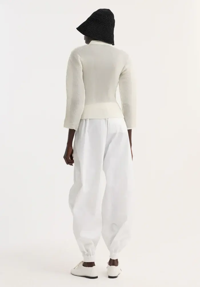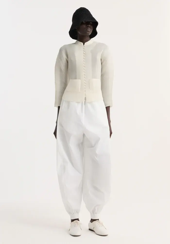 A structured plissé cardigan with a stand-up collar, fabric-covered buttons and small patch pockets. Designed with a slightly cropped fit, it offers an elegant layer for special occasions.