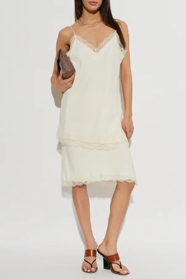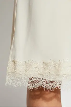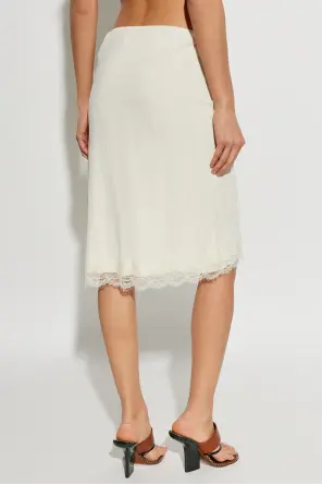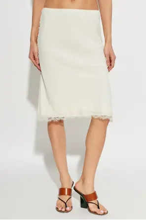 The Skirt with Lace Trim by RÓHE embodies timeless classic style and subtle sensuality. Its simple, slightly flared midi cut accentuates the silhouette while ensuring freedom of movement. The smooth fabric, inspired by silk and satin, captivates with a delicate, creamy hue that radiates refined elegance.