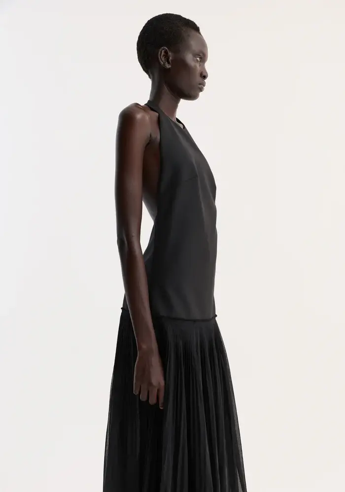 A halter dress featuring a structured wool-fused bodice and low back, flowing into a pleated muslin skirt that extends to full length, creating movement and fluidity in the silhouette.
