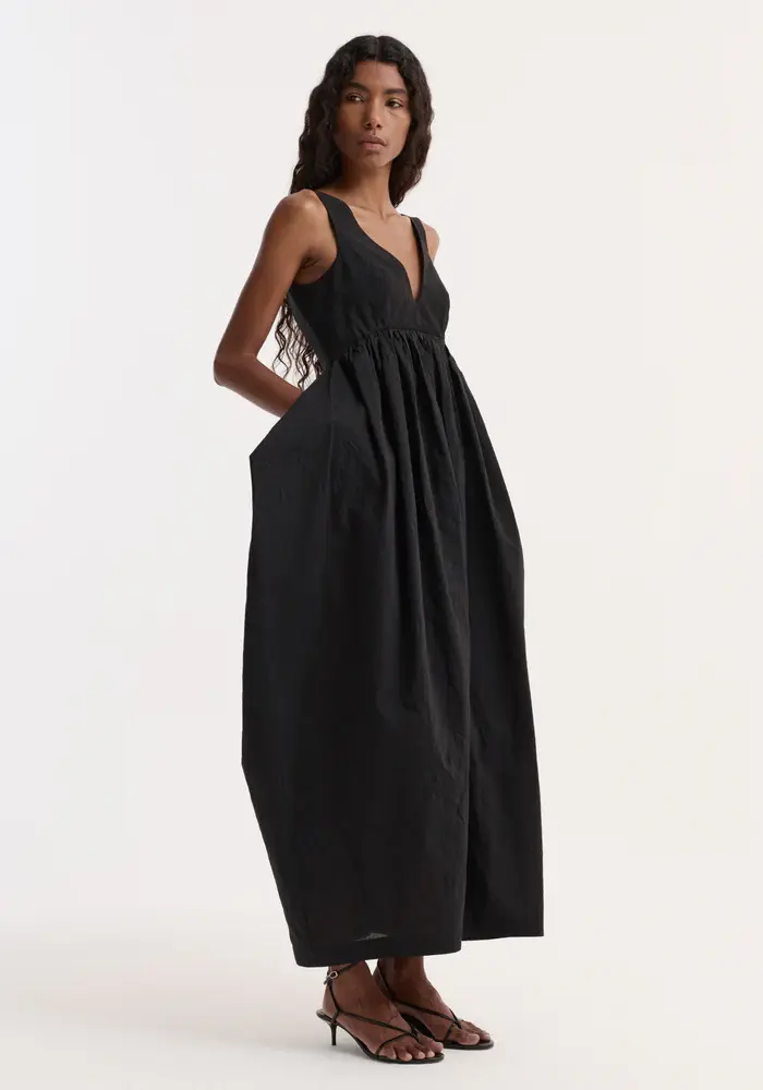 A summer dress crafted from textured cotton. With a v-neckline, and low back, the skirt gathers above the waist and and comes together at the hem to create volume and a trapezium shape through the skirt.